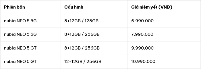 Dưới đây là bảng giá niêm yết cho các phiên bản của nubia NEO 5 Series:
