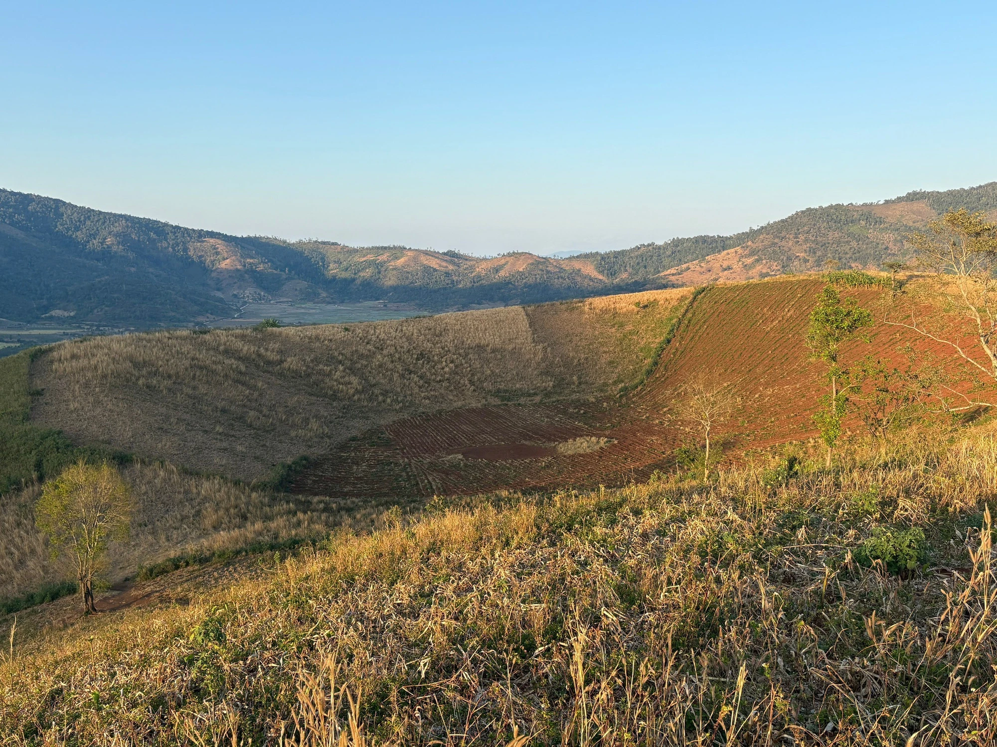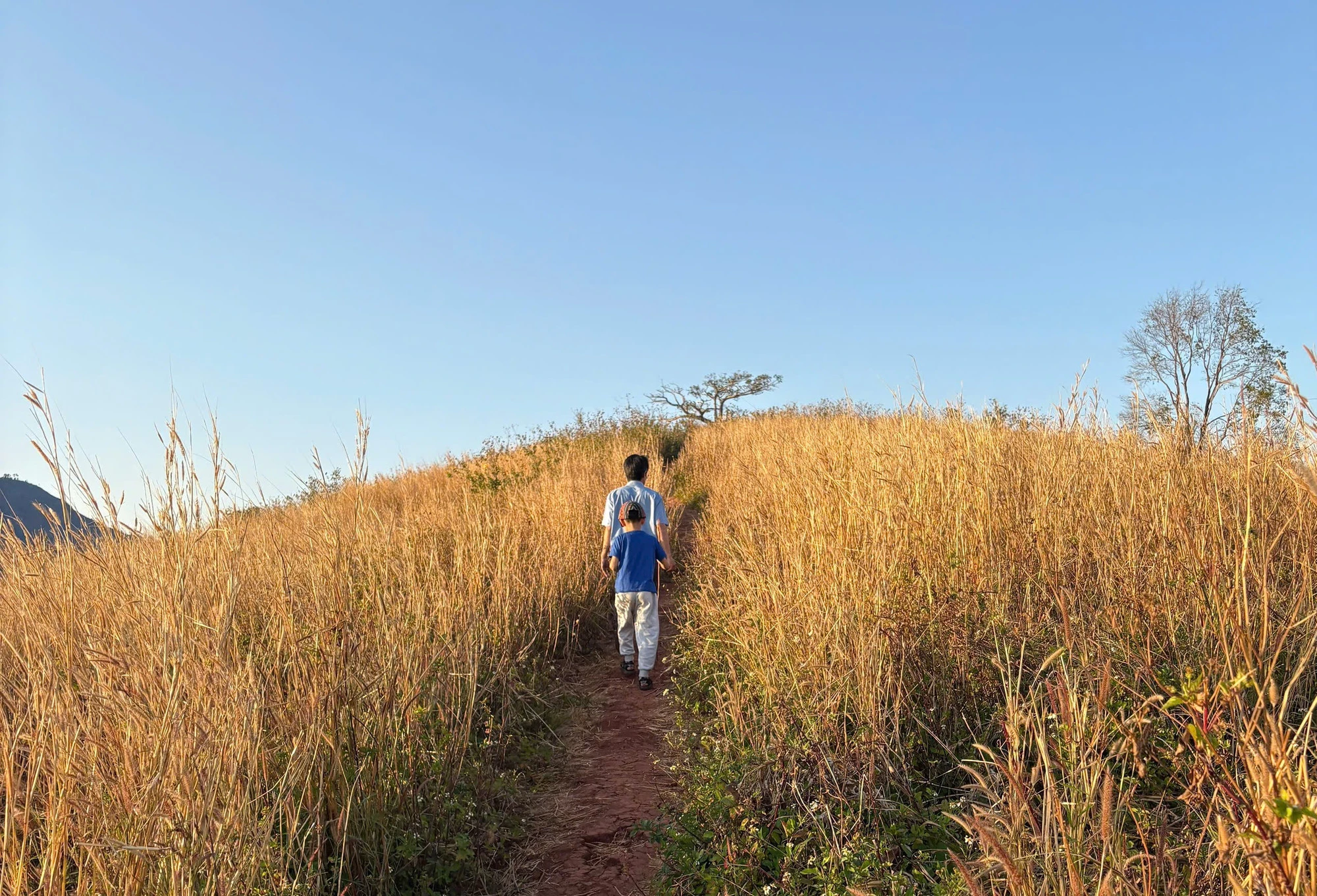 Giữa những hoang tàn khô cháy nắng của đám cỏ dại, vài bông dã quỳ còn sót lại vẫn cố vươn mình khoe nốt sắc vàng, những cây cổ thụ trơ trọi nằm rải rác trên đỉnh núi bỗng trở nên kỳ vĩ hơn. Dưới gốc cây là những miệng hố núi lửa như chiếc chảo lớn khổng lồ, phía trên là bầu trời cao trong xanh vời vợi.
