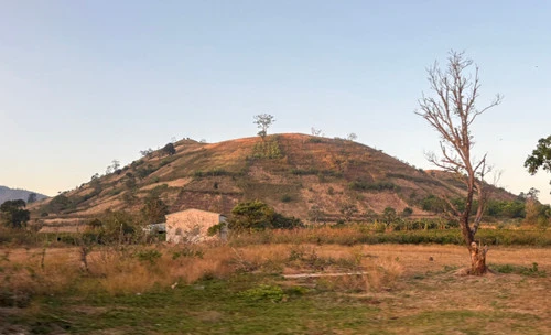 Từ Ia Gri nhìn lên, núi lửa Chư Đang Ya sừng sững, đỉnh núi quanh năm phủ mây trắng. Những khoảnh đất nâu, xanh, vàng xen kẽ trên sườn núi, tựa tấm thổ cẩm khổng lồ.