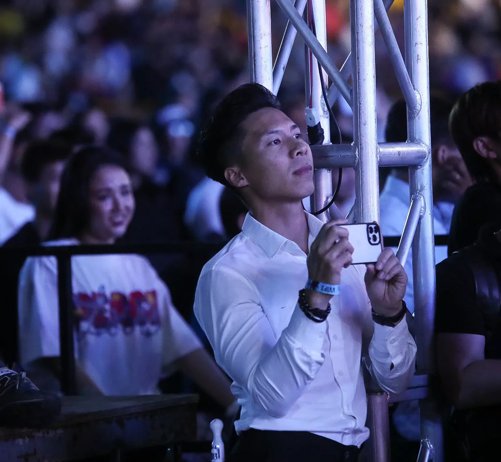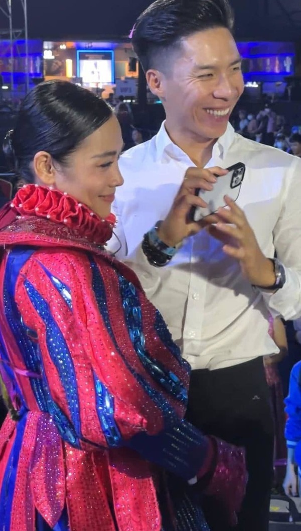 Nam nghệ sĩ cầm điện thoại ghi lại và theo dõi suốt phần trình diễn của vợ. (Ảnh: Hội Showbiz)