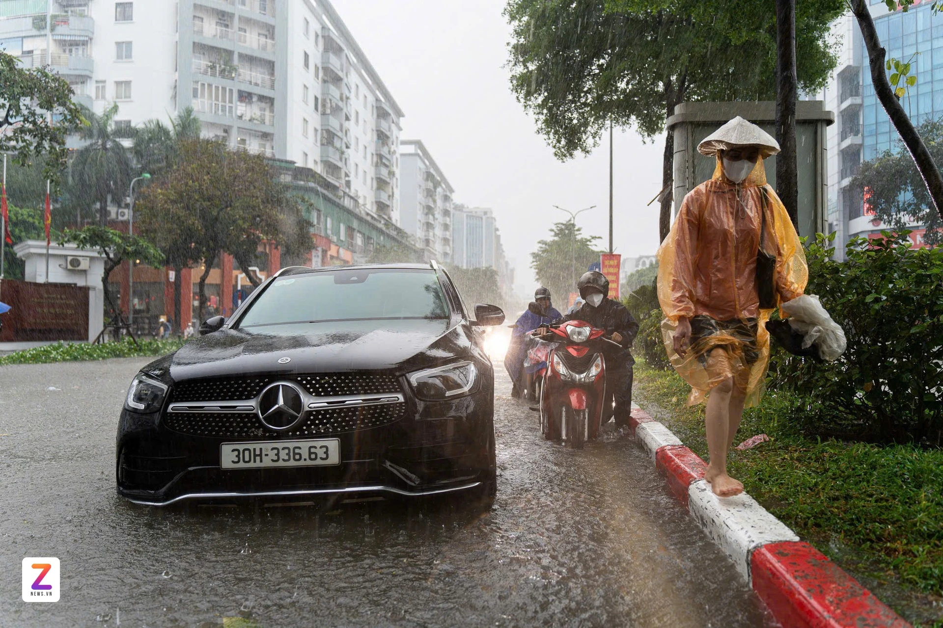 Chiếc Mercedes-Benz “bất lực”, không thể di chuyển giữa con đường ngập nước và phải gọi cứu hộ trên phố Thái Hà.