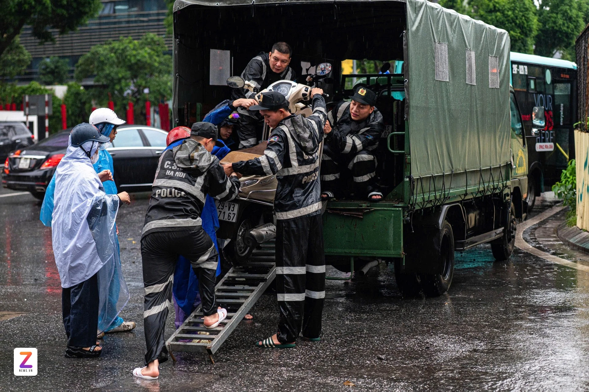 Ghi nhận tại ngã tư Liễu Giai – Đào Tấn, lực lượng CSCĐ phải sử dụng xe chuyên dụng để hỗ trợ người dân di chuyển xe máy ra khỏi điểm ngập úng.