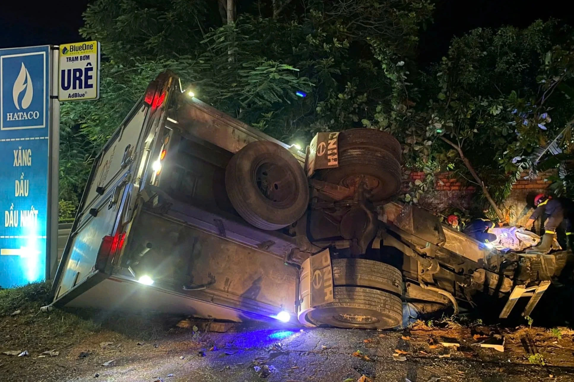 Cú va chạm mạnh khiến xe tải bị hư hỏng nặng, lật nghiêng xuống hố sâu bên đường. Có 2 người trên xe tải bị thương, được người dân hỗ trợ đưa đi cấp cứu còn tài xế T. bị kẹt cứng trong cabin xe.