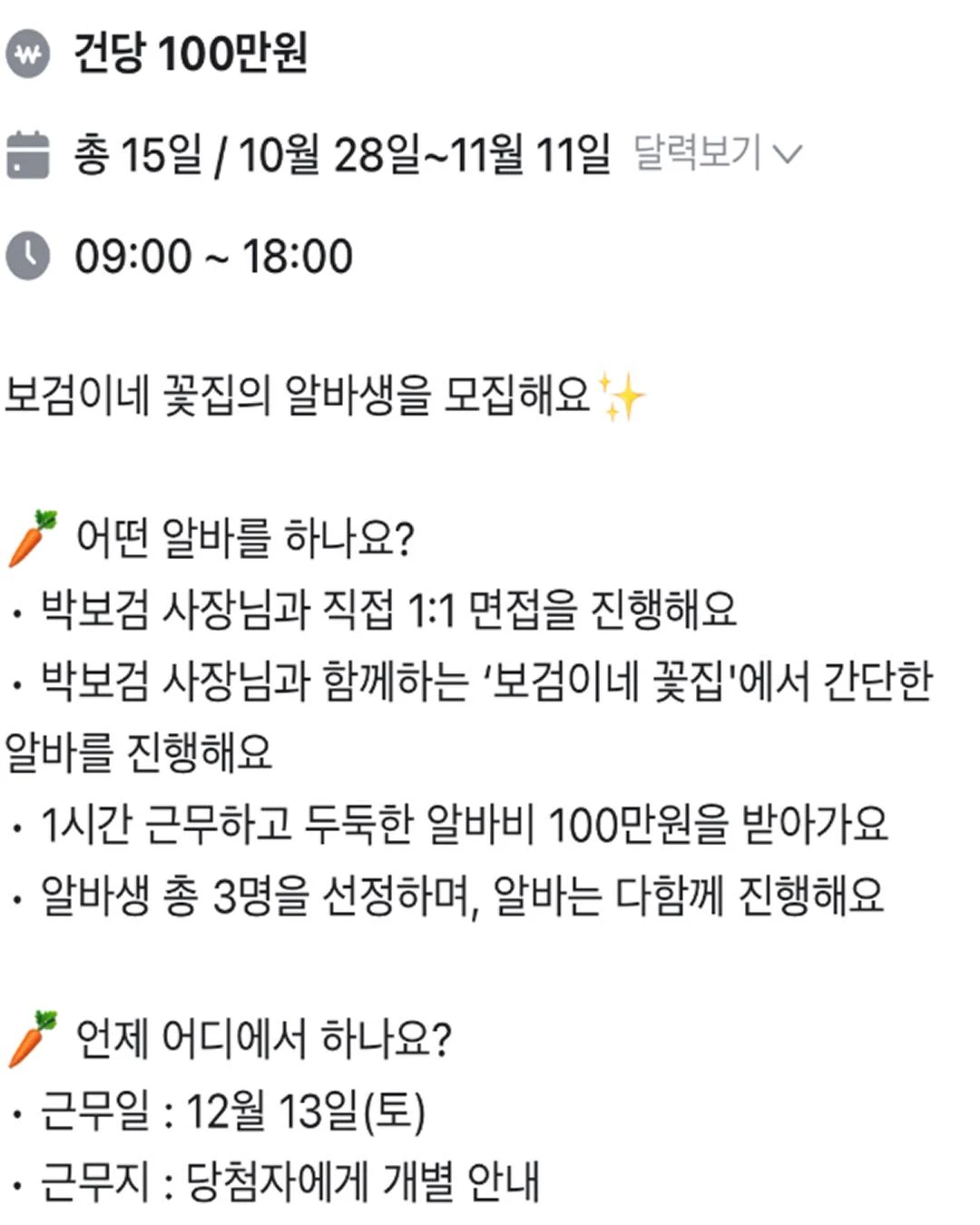 Chiều 30/10, tờ Xportsnews đưa tin, 1 app bán đồ cũ mới đây đã khiến cộng đồng mạng xứ Hàn xôn xao khi công bố thông tin tuyển dụng với mức lương khó tin. Theo đó, các ứng viên sẽ tham gia buổi phỏng vấn trực tiếp với Park Bo Gum. 3 người trúng tuyển sẽ được làm việc cùng nam tài tử họ Park tại 1 cửa hàng có tên “Tiệm hoa của Park Bo Gum”. Đáng nói, ca làm của mỗi người trúng tuyển chỉ kéo dài 1 giờ đồng hồ nhưng được trả công vô cùng hậu hĩnh – lên tới 1 triệu won (19 triệu đồng).