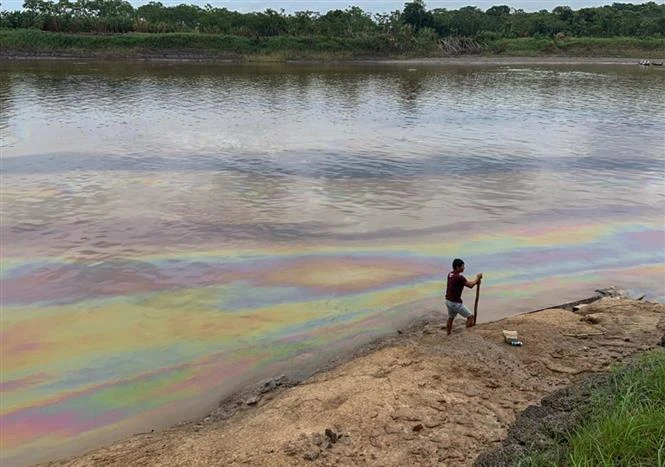 Vệt dầu loang trên sông Cuninico, một nhánh chính của sông Maranon tại Loreto, Peru năm 2022. Ảnh: AFP/TTXVN