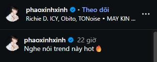 Mới đây, nữ rapper sinh năm 2003 tiếp tục thu hút sự chú ý khi đăng clip bắt trend cùng một người đàn ông bí ẩn, kèm chú thích: “Nghe nói trend này hot”. Dù vậy, cô khéo léo dùng icon để che mặt đối phương. Điều khiến dân mạng bàn tán là ở bài đăng này, Pháo còn đính kèm một ca khúc của nam rapper sinh năm 1996. Chi tiết này khiến nhiều người cho rằng cô đang ngầm xác nhận mối quan hệ tình cảm với anh.