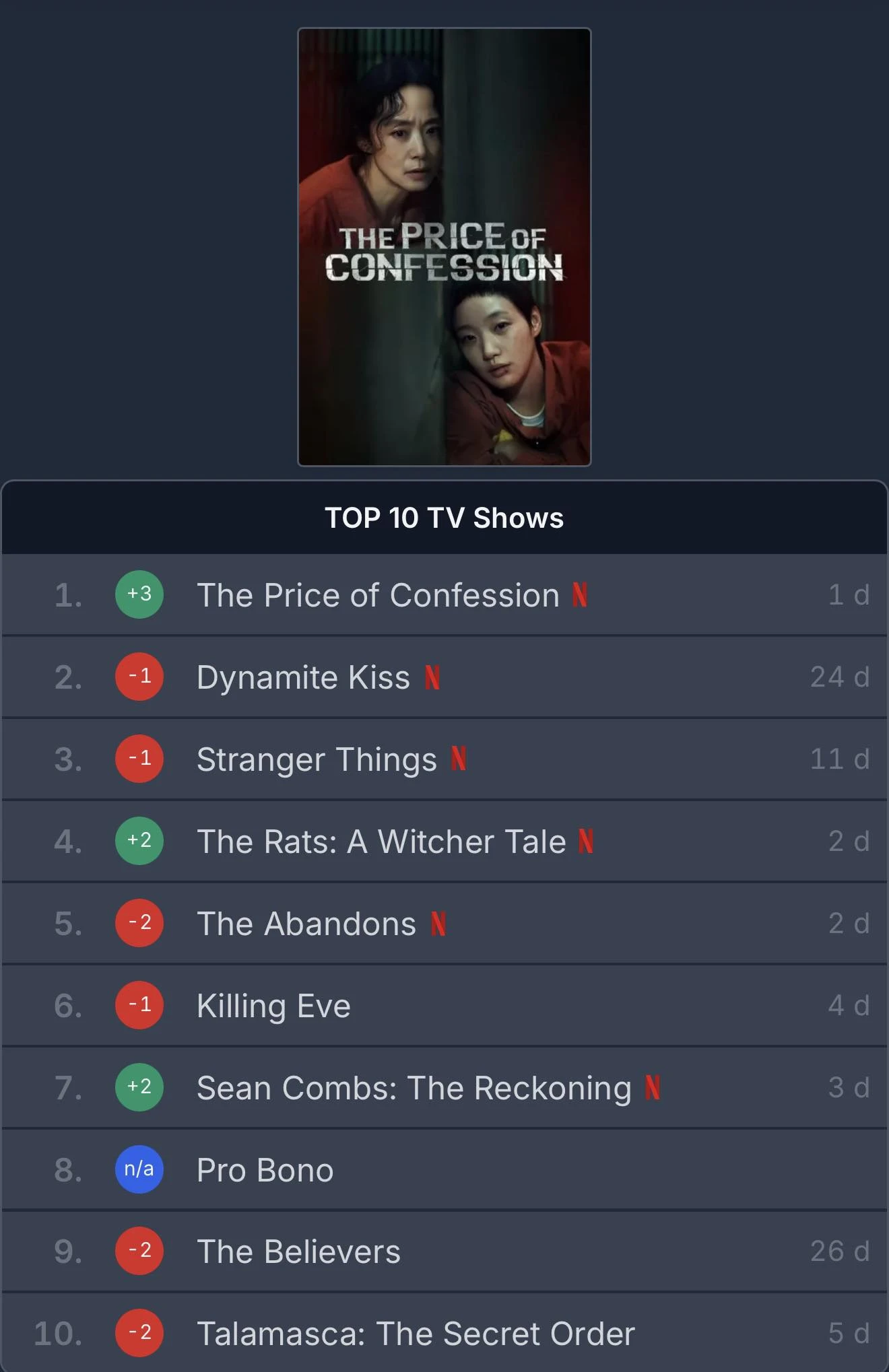 Vừa lên sóng một ngày, The Price of Confession (Tựa Việt: Cái Giá Của Lời Thú Tội ) đã leo thẳng Top 1 Netflix Việt Nam, đồng thời tạo nên hiệu ứng bùng nổ hiếm thấy trên toàn châu Á. Chỉ trong vòng 48 giờ, bộ phim 18 leo lên vị trí số 1 tại Hàn Quốc và Việt Nam, giữ top 3-5 ở nhiều quốc gia lân cận, đạt trend ranking 91,7% và nhận loạt điểm số ấn tượng từ khán giả quốc tế: IMDb 8.5, MyDramaList 8.3 – mức rất cao với dòng phim thriller, FlixPatrol 93 điểm, còn giới phê bình Mỹ chấm đến 9.5/10. Phim cũng liên tục xuất hiện trong mục gợi ý nổi bật của Netflix, trong khi diễn xuất của Kim Go Eun và Jeon Do Yeon được truyền thông nước ngoài tán dương không ngớt.