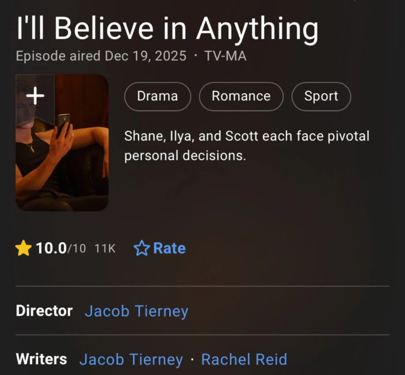Trên IMDb, Heated Rivalry sở hữu số điểm cao vút, với tập 5 từng được chấm điểm 10/10 chưa từng thấy. Sau đó, làn sóng 1 sao bất ngờ đổ bộ với hơn 1000 lượt đánh giá, khiến điểm tập phim tụt xuống 9,9 – con số vẫn cao nhất cả năm 2025.