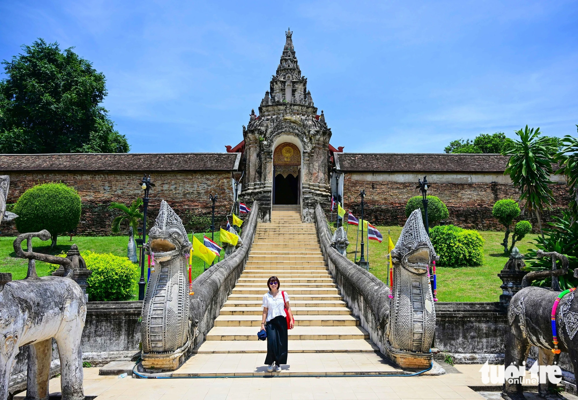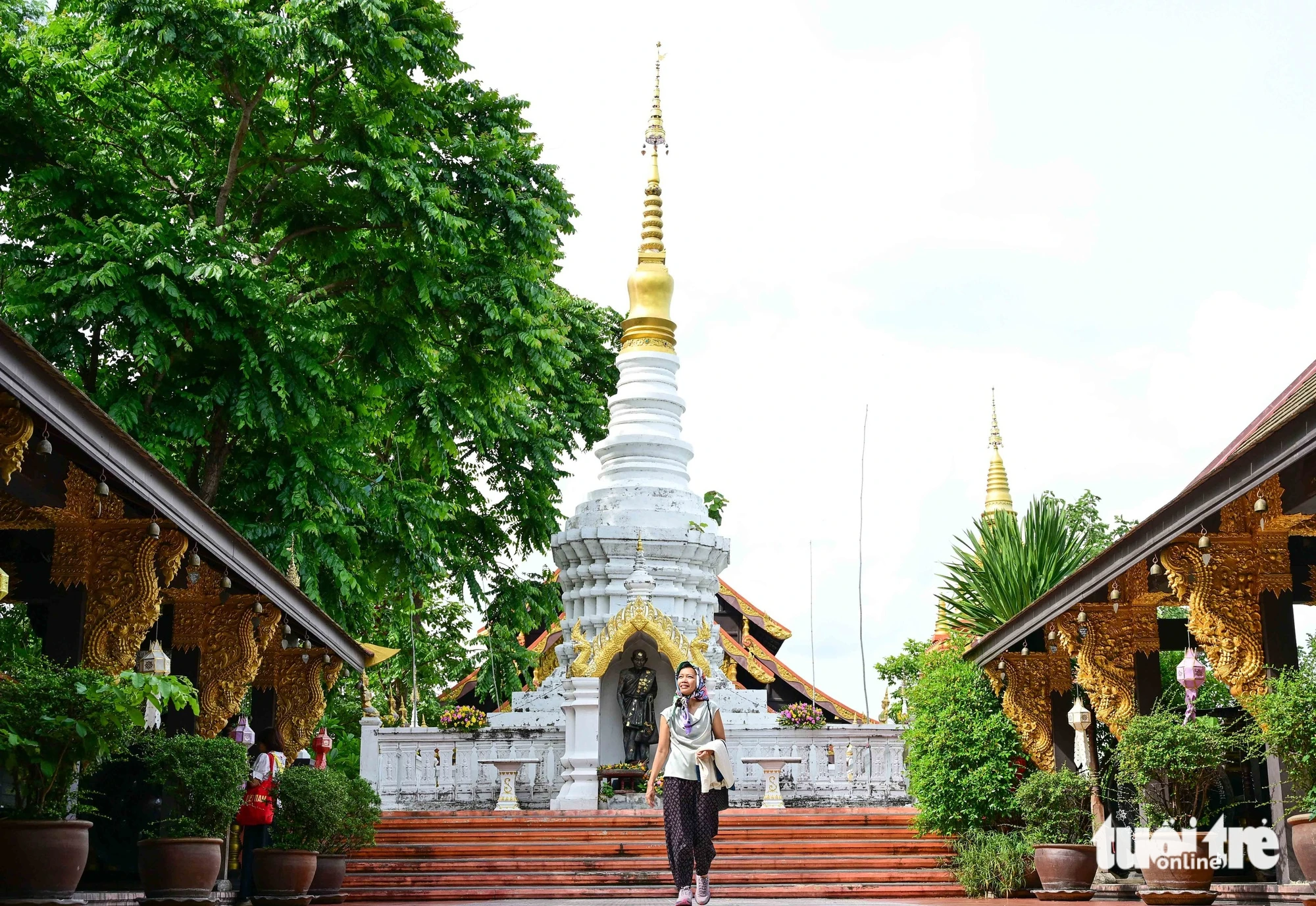 Sáng ngày thứ hai ở Chiang Mai, chị Mai Anh ghé chùa Doi Suthep, tên gọi chính thức là Wat Phra That Doi Suthep. Ngôi chùa Phật giáo nằm trên đỉnh núi Doi Suthep, nơi du khách có thể phóng tầm mắt bao quát toàn cảnh thành phố Chiang Mai, được xem là một trong những điểm hành hương quan trọng bậc nhất miền bắc Thái Lan. Chùa nổi bật với bảo tháp dát vàng rực rỡ, những đường nét chạm khắc tinh xảo cùng lối kiến trúc mang dấu ấn văn hóa Lanna.