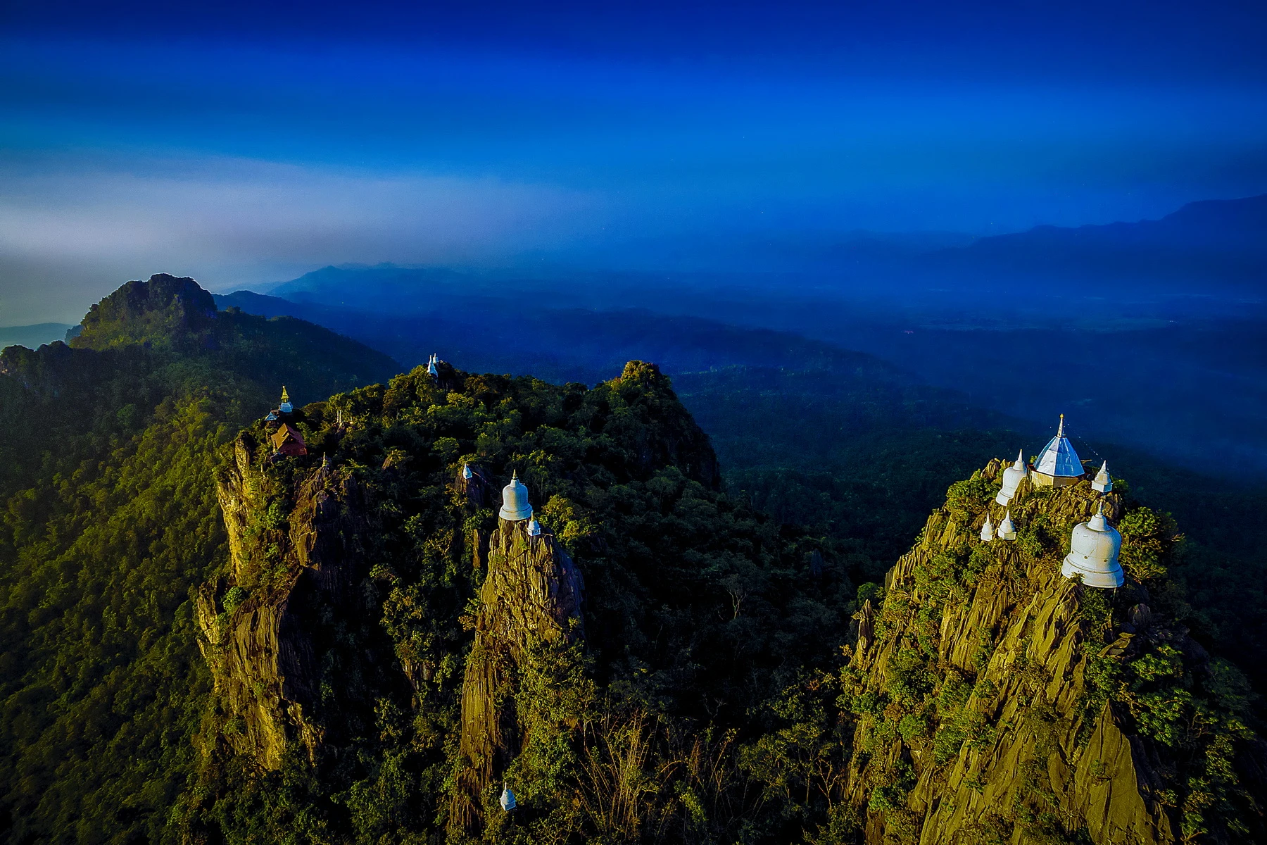 Các bảo tháp trắng nằm trên đỉnh núi mờ sương tạo nên hình ảnh được gọi là "bảo tháp lơ lửng" hoặc "bảo tháp thiên giới" - Ảnh: Tổng cục Du lịch Thái Lan