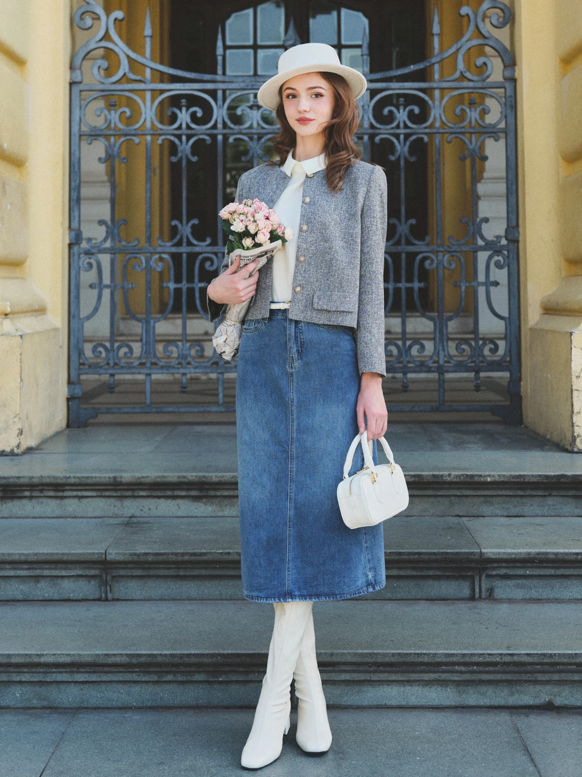Chân váy dài từ vải denim phù hợp với áo khoác màu xám, các món đồ tông trắng sáng như áo cổ nơ, bốt, mũ và túi xách bổ sung cho bản phối giành trọn "điểm 10" hoàn hảo về phong cách mùa lạnh