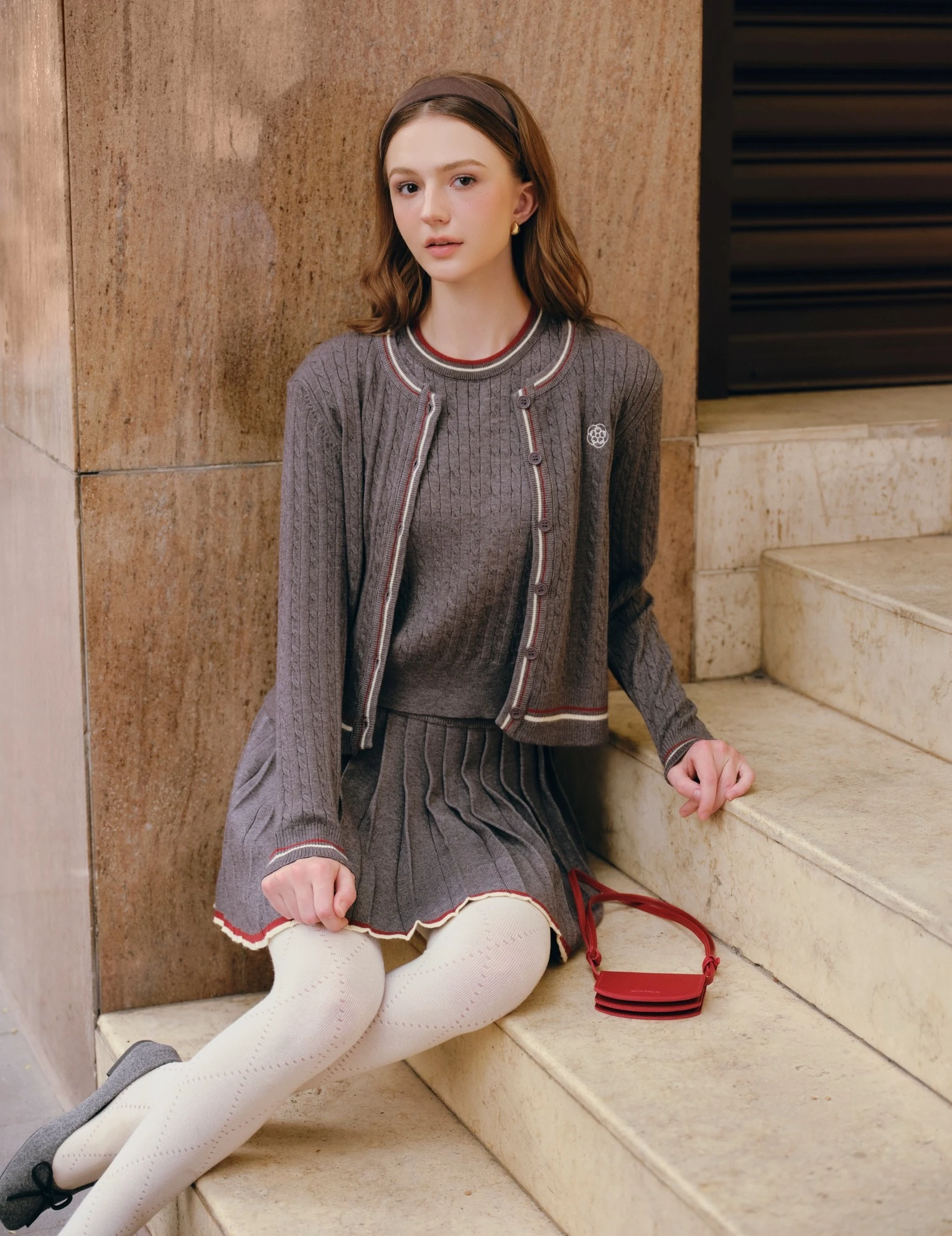 Bản phối knitwear với tông xám ấm áp, cùng những đường viền đỏ trắng tạo điểm nhấn. Combo gồm áo len, áo khoác cardigan và chân váy xếp ly tạo nên tổng thể trẻ trung; phối với tất dáng dài và giày Mary Jane càng tăng điểm ngọt ngào