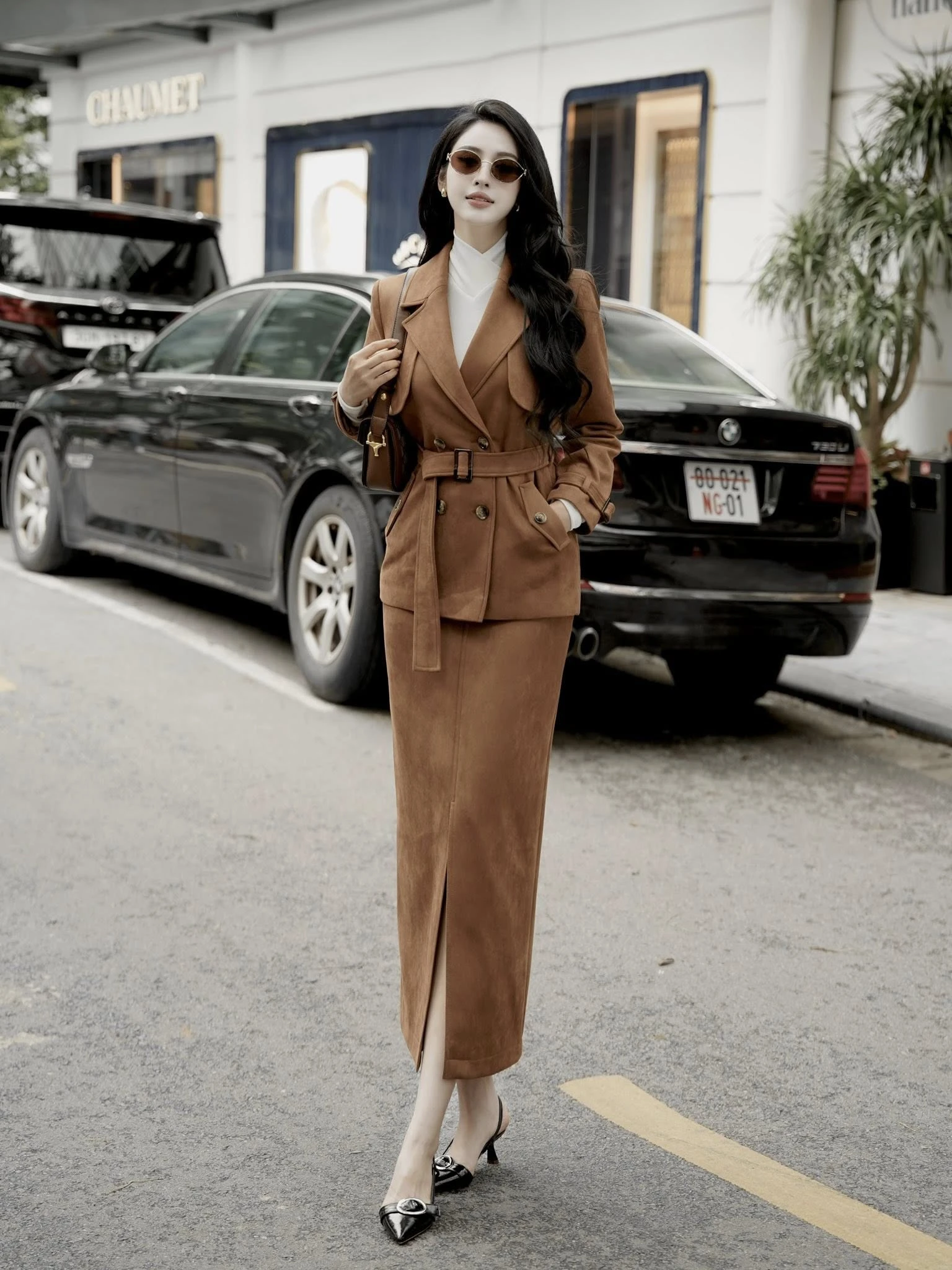 Áo măng tô nâu sang trọng, thiết kế tinh tế với phom dáng gọn gàng, tôn vai và eo nhẹ nhàng, phối cùng chân váy đồng điệu để tạo nên set đồ hoàn hảo, giúp nàng vừa thanh lịch, vừa có gu