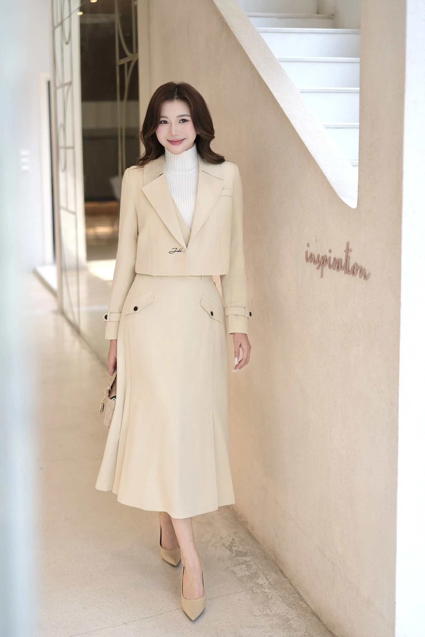 Trên nền chất liệu cao cấp, set áo vest crop top trẻ trung phối cùng chân váy xếp ly dài thanh lịch đang liên tục “cháy hàng”. Sắc ghi trang nhã hòa quyện cùng kỹ thuật thêu thủ công tinh xảo trên thân áo, tạo nên vẻ dịu dàng và cuốn hút