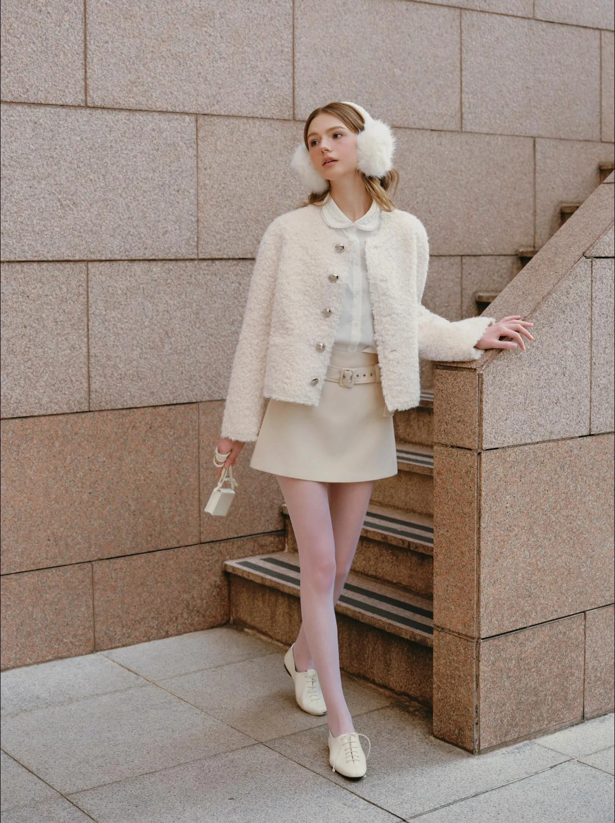 Áo khoác lông xù gam trắng kem như lớp bông tuyết mịn, điểm thêm cúc kim loại ánh vàng tựa những hạt sáng nhỏ lấp lánh. Kết hợp thêm chân váy cùng tông kèm dây đai và giày búp bê, nàng tỏa sáng với diện mạo yêu kiều