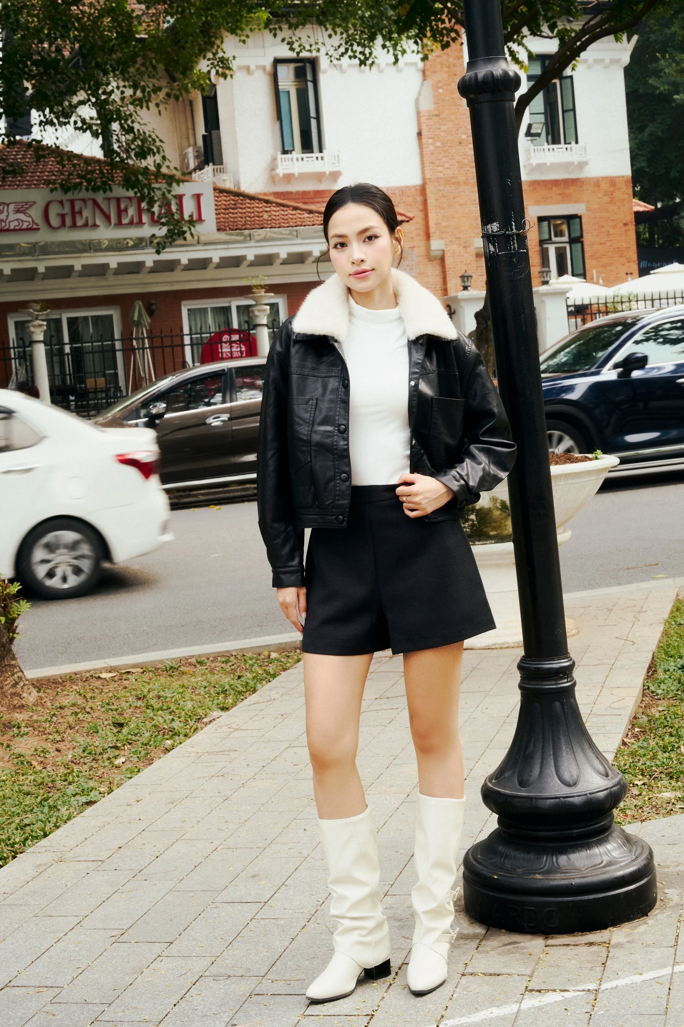 Áo khoác với bề mặt da mịn màng mang đậm tinh thần hiện đại pha nét cổ điển. Bên trong lớp lót lông mềm ôm ấp nàng trong cảm giác ấm êm và dịu nhẹ. Kết hợp cùng chân váy màu đen tone sur tone giúp tổng thể trở nên có chiều sâu