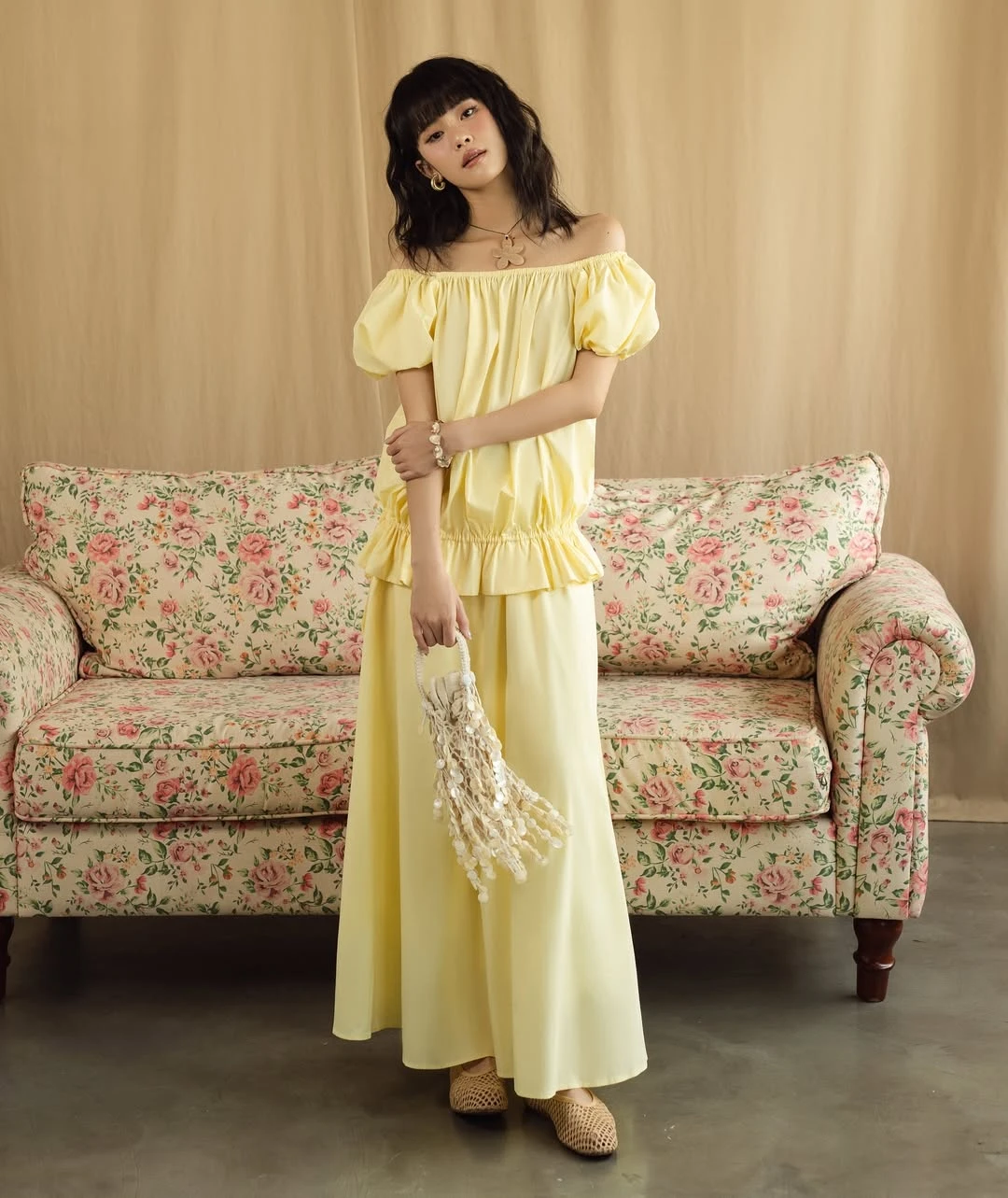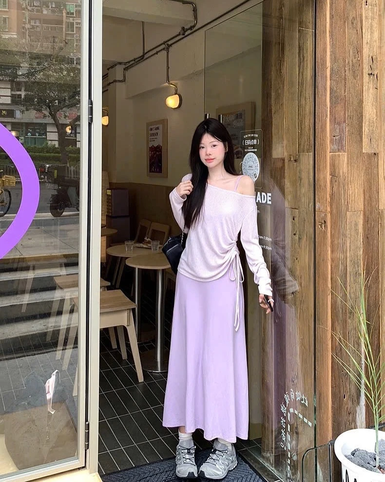 Kết hợp cùng chân váy dài cùng màu sẽ giúp tổng thể bộ đồ thêm hài hòa, phù hợp cho những buổi cà phê hay chụp hình ngoài trời.