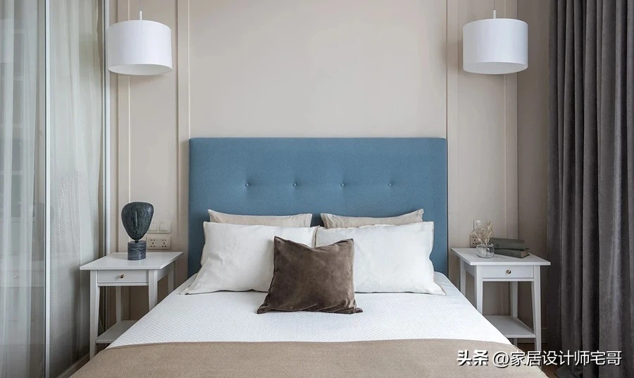 Phòng ngủ cũng có cửa sổ lớn như phòng khách nhưng dùng rèm tối màu để đảm bảo giấc ngủ.