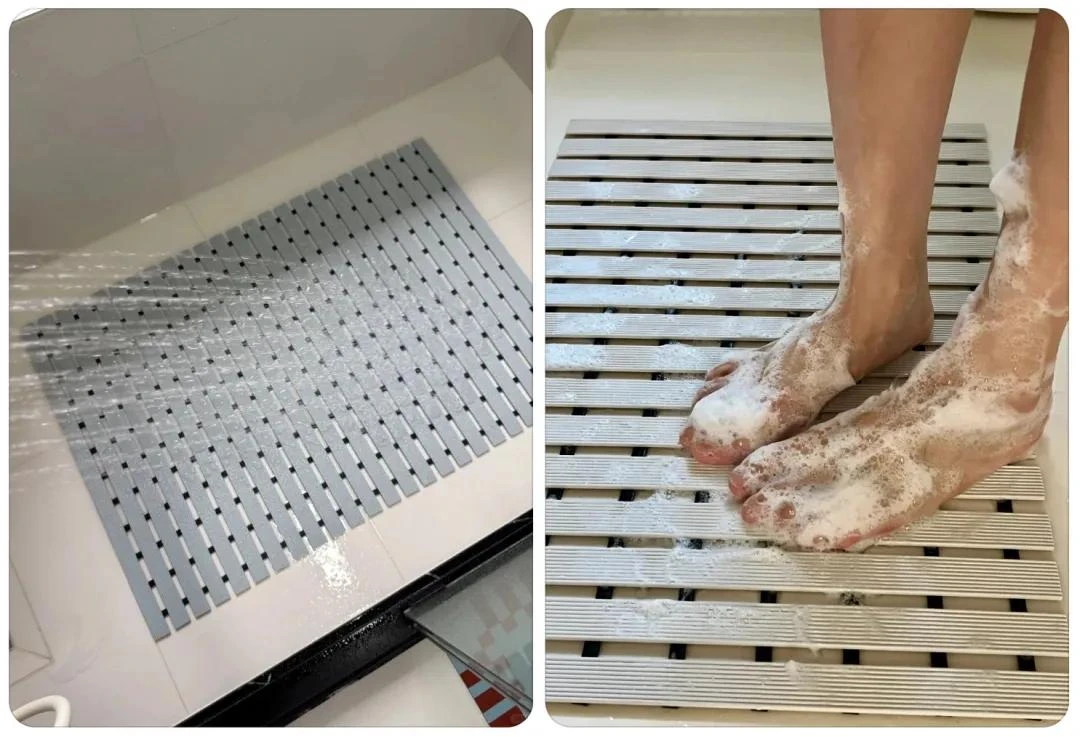 Bề mặt thoáng, nước thoát ngay, không đọng cặn bẩn. Hai mặt đều chống trượt nên đứng rất chắc chân. Sau khi tắm chỉ cần xả nước rửa lại, dựng lên cho ráo – không mùi, không ẩm.