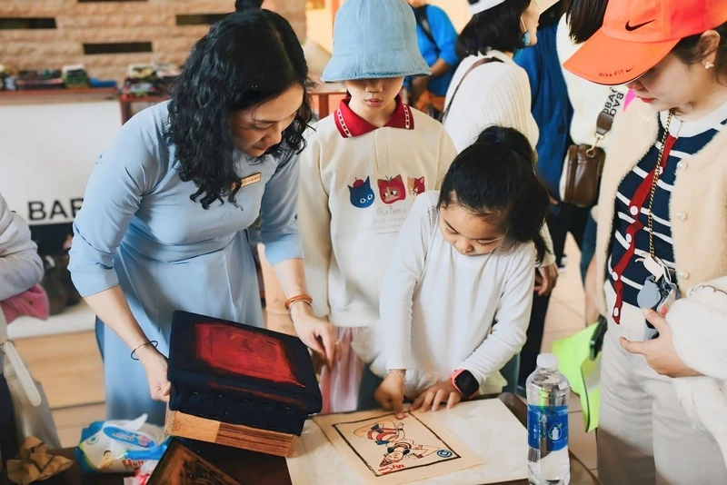 Du khách trực tiếp trải nghiệm in tranh Đông Hồ. Ảnh: Diễm Phúc