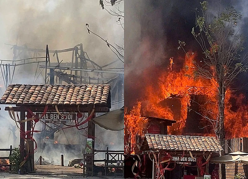 Chỉ trong ít phút, đám cháy bao trùm diện tích quán, cột khói đen bốc cao hàng chục mét kèm theo lửa đỏ rực, đe dọa các hộ dân lân cận.