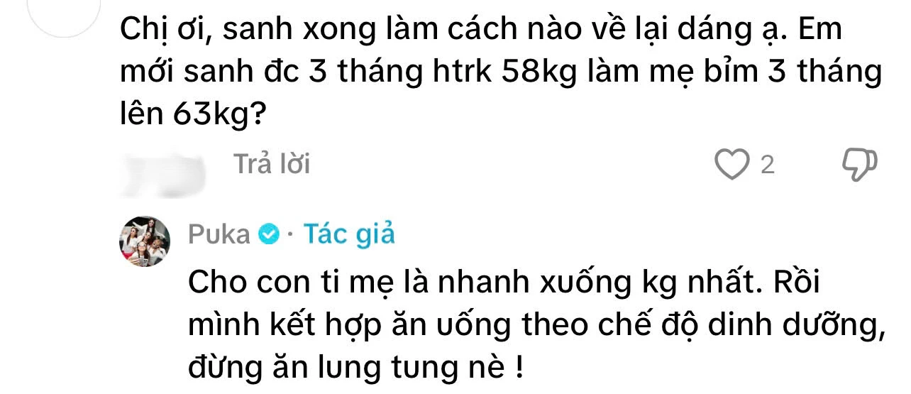 Dưới phần bình luận, Puka còn nhiệt tình trò chuyện với cư dân mạng. Một netizen còn hỏi nữ diễn viên về cách giảm cân: “Chị ơi, sanh xong làm cách nào về lại dáng ạ. Em mới sinh được 3 tháng, hồi trước 58kg làm mẹ bỉm 3 tháng lên 63kg”. Bà xã Gin Tuấn Kiệt chia sẻ: “Cho con ti mẹ là nhanh xuống kg nhất, Rồi mình kết hợp ăn uống theo chế độ dinh dưỡng, đừng ăn lung tung nè”.