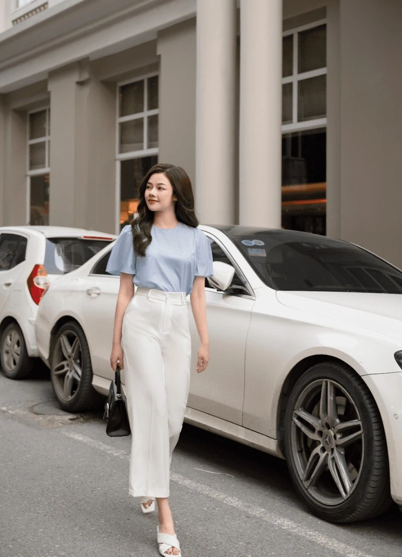 Sự kết hợp giữa trắng tinh giản và xanh dịu nhẹ giúp tổng thể trở nên tươi mới mà vẫn chuẩn mực nơi công sở. Phối cùng dép cao gót tông be và túi xách da cầm tay sang trọng để hoàn thiện diện mạo cuốn hút, dễ dàng nổi bật trong những buổi họp cuối ngày hay dạo phố nhẹ nhàng.
