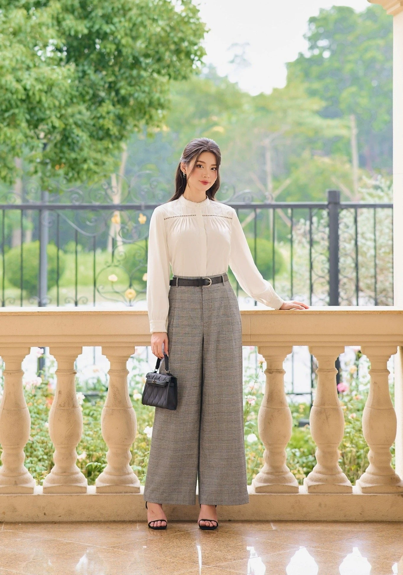 Khi kết hợp với áo sơ mi cổ sen màu trắng, nàng có ngay một set đồ vừa kín đáo vừa sang trọng. Giày cao gót mũi nhọn tông trắng cùng túi xách đeo vai đồng điệu tạo nên tổng thể hài hòa, giúp nàng tự tin đi làm hay gặp gỡ đối tác.