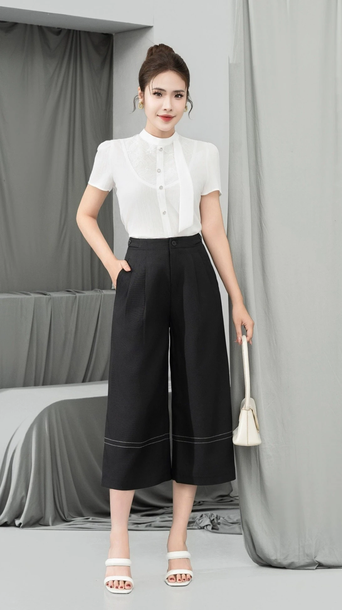 Để tạo hiệu ứng thanh lịch , bạn có thể chọn quần culottes sắc trắng dáng lửng, sơ vin khéo léo cùng áo sơ mi xanh pastel . ẢNH: @CALIE.STORES