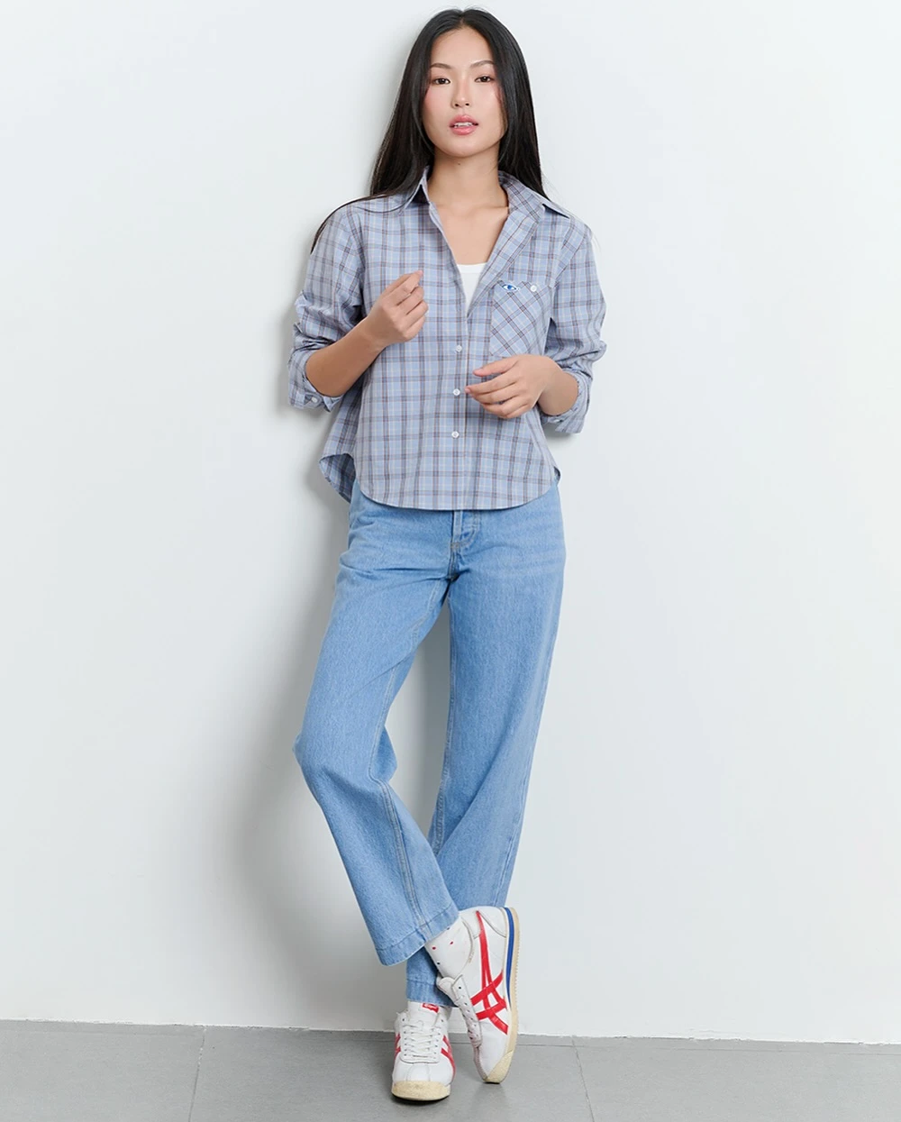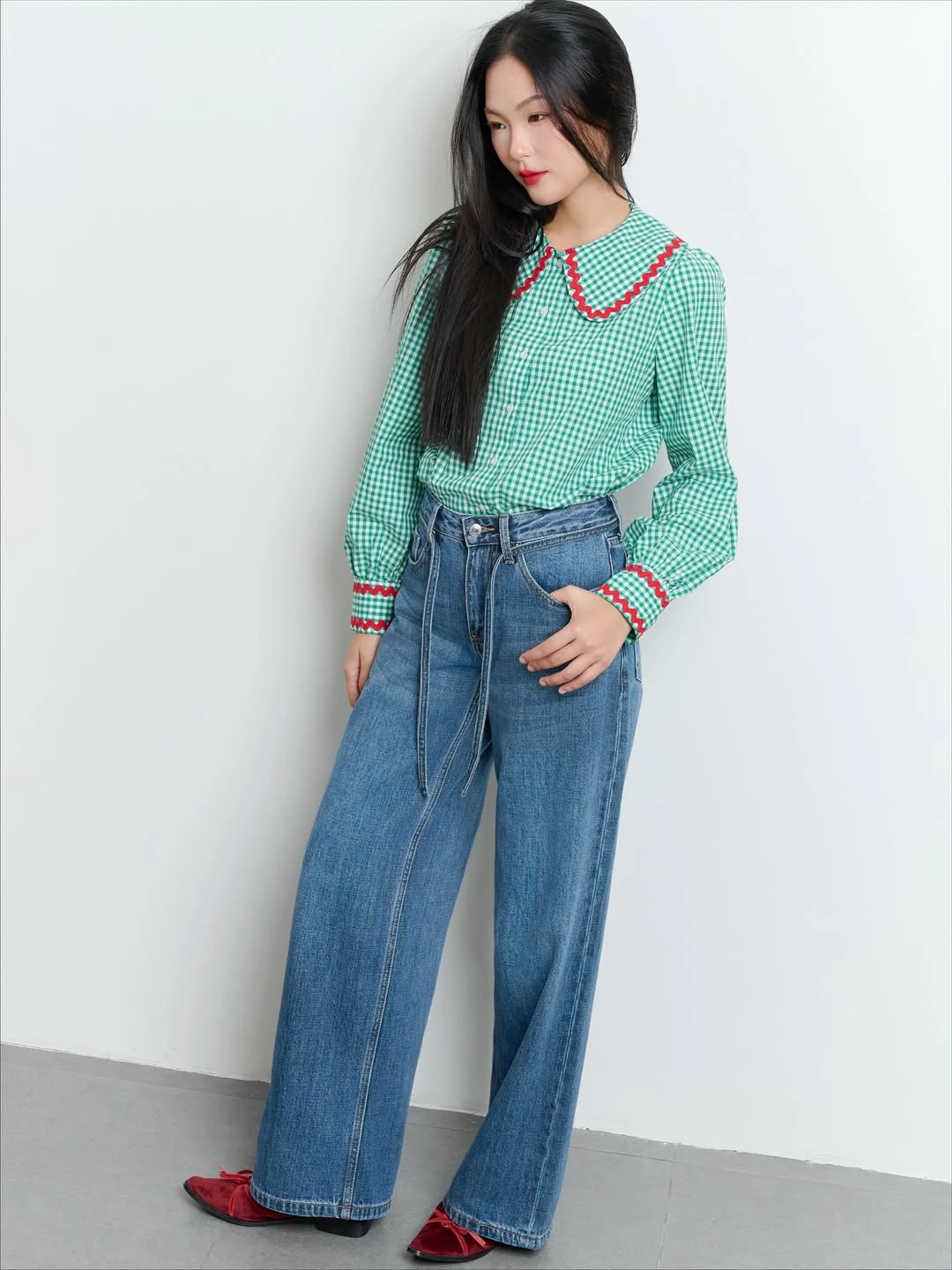 Tỏa sáng vẻ đẹp nữ tính, sự dịu dàng quyến rũ khi nàng khoác lên mình cặp đôi quần denim và áo sơ mi họa tiết gingham xanh viền zig zag đỏ. Lựa chọn bỏ áo ngoài quần mang lại sự thoải mái nhẹ nhàng trong khi ý tưởng thứ hai giúp tôn eo tốt hơn, tạo điểm nhấn thị giác hiệu quả hơn với các cô nàng có vóc dáng nhỏ nhắn