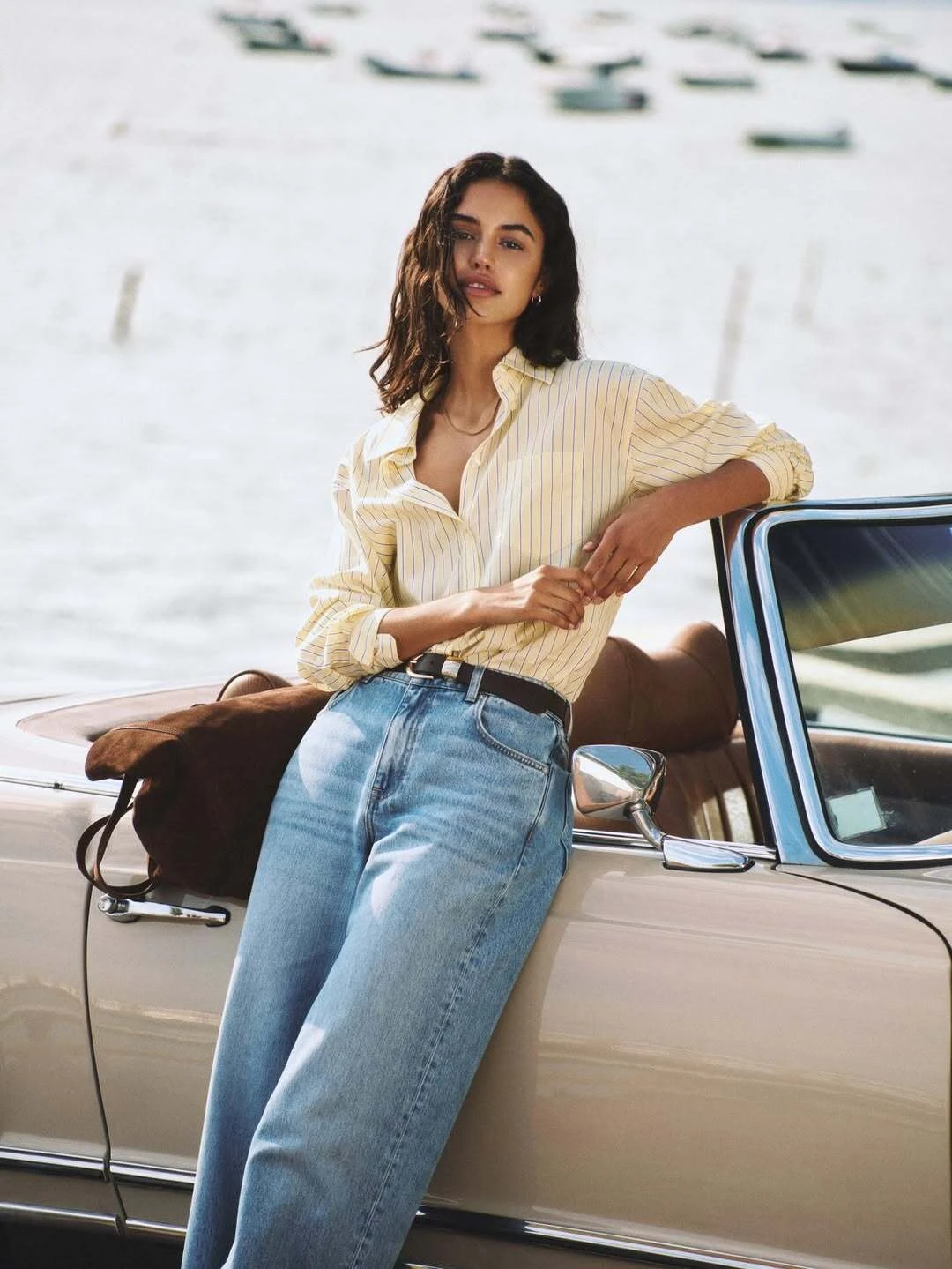 Dây lưng da giúp bản phối quần jeans ống rộng và sơ mi kẻ sọc dọc trở nên chuyên nghiệp, lịch sự và có điểm nhấn hơn. Hình ảnh cổ điển sang trọng này luôn là một trong những công thức mặc đẹp bền bỉ và có giá trị vượt thời gian
