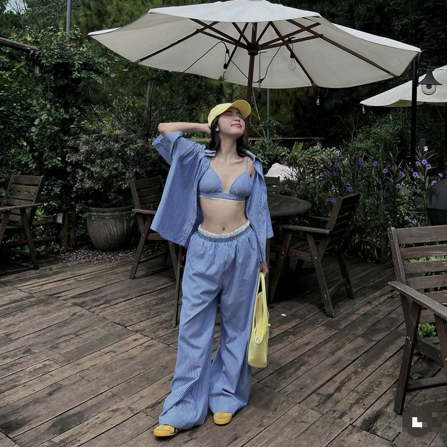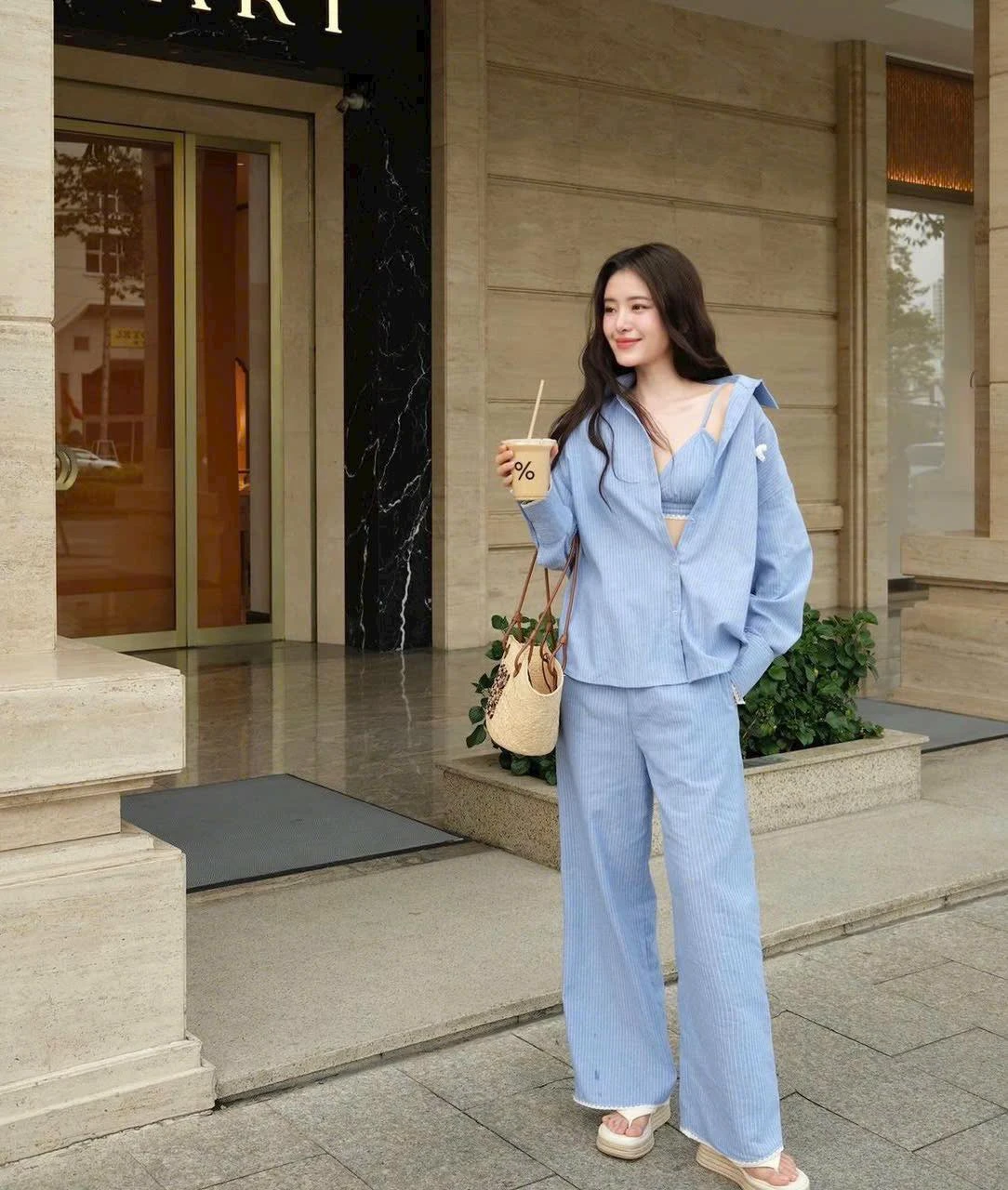 Sơ mi dáng oversized buông hờ hoặc cài 1, 2 nút, với chiếc bra bên trong, quần kẻ sọc dáng rộng, vừa gợi cảm nhưng lại không sợ phản cảm