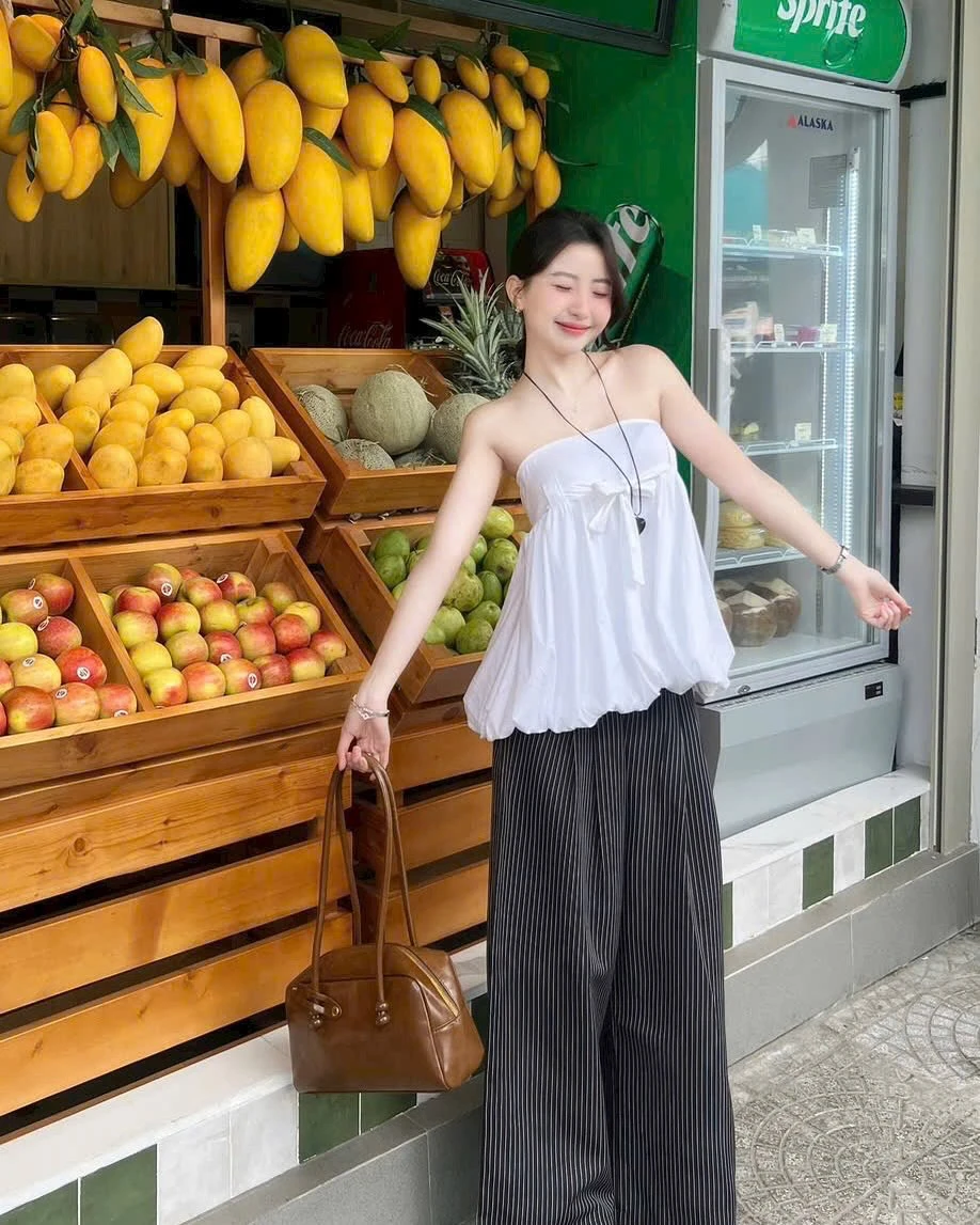 Đây là sự lựa chọn hoàn hảo dành cho các nàng theo đuổi phong cách bay bổng, gợi cảm nhưng vẫn đảm bảo sự thoải mái. Áo ống xòe bồng tôn lên vóc dáng mảnh khảnh cũng như phần xương quai xanh quyến rũ, quần họa tiết kẻ sọc hack chiều cao cũng như che khuyết điểm cho chân.