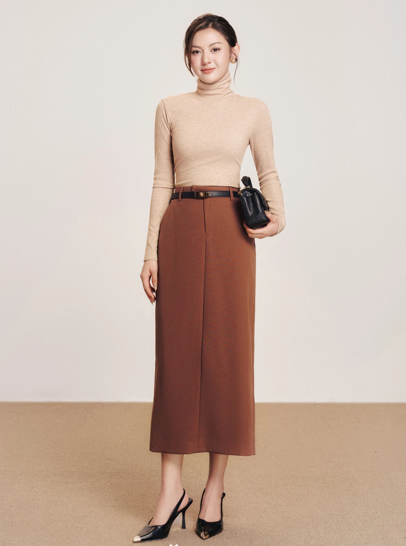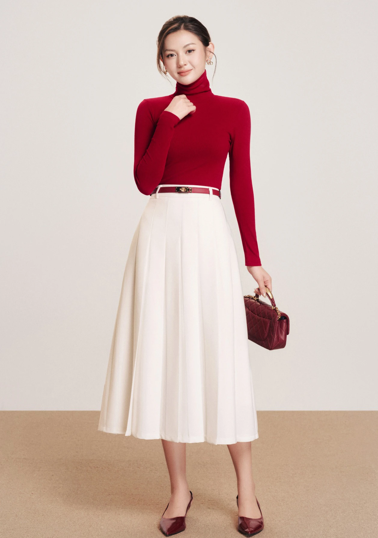 Chân váy xếp ly dáng dài có thể là lựa chọn thoải mái dù hiệu năng tôn dáng kém hơn chân váy bút chì nhưng vẫn đảm nhiệm tốt vai trò. Kết cấu các nếp gấp theo chiều dọc làm tăng thêm hiệu ứng thị giác nên khi phối cùng áo cổ cao tay dài kèm dây lưng nhỏ có thể tạo nên các bản phối mãn nhãn và ấn tượng