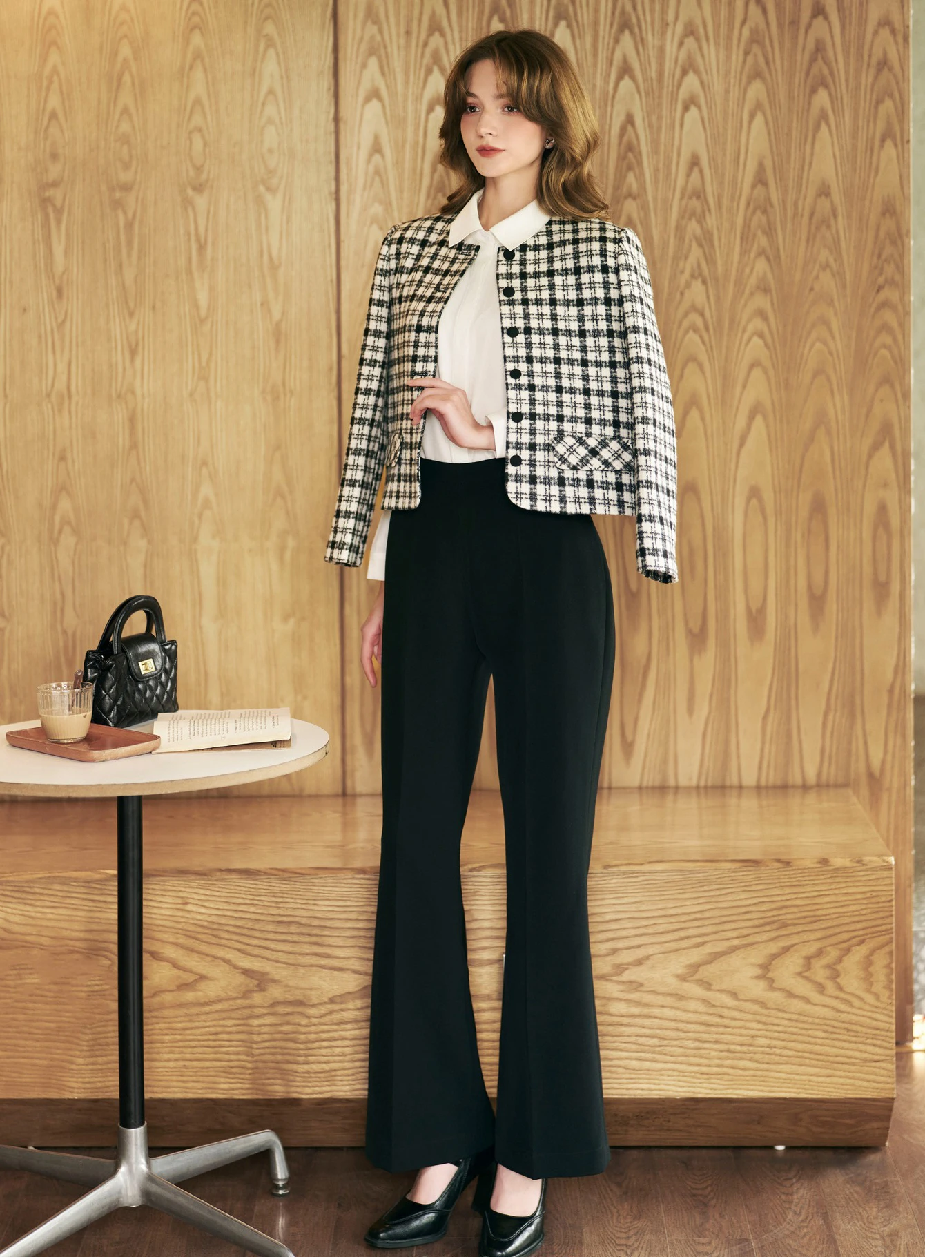 Quần ống loe tông màu tối gợi nhắc phong cách cổ điển thanh lịch. Bản phối kết hợp jacket họa tiết nanh sói, sơ mi trắng và giày pump cao gót tinh giản mang đến hình ảnh hài hòa, trang nhã và chuyên nghiệp