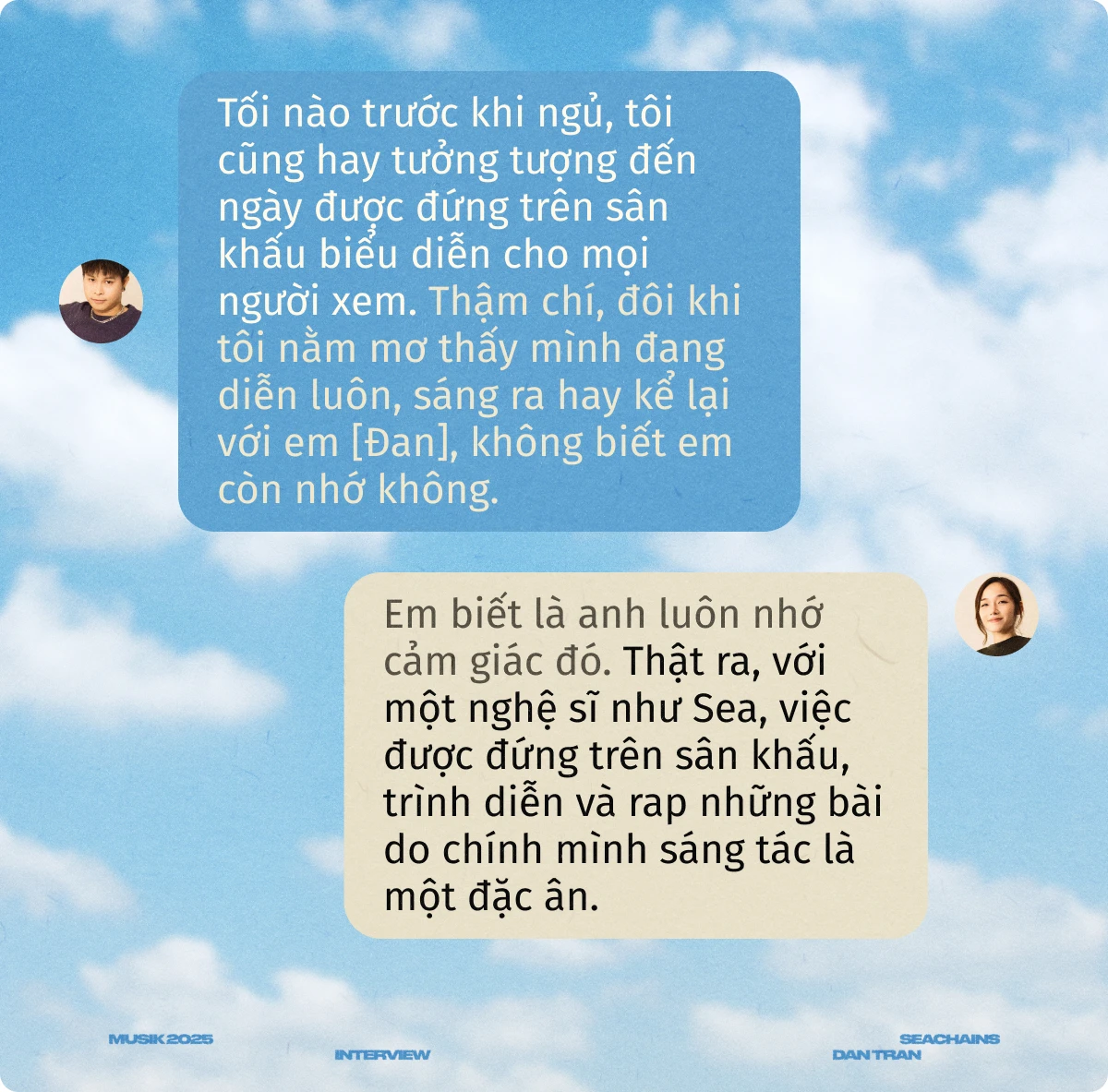 Dan Tran: Em biết là anh luôn nhớ cảm giác đó. Thật ra, với một nghệ sĩ như Sea, việc được đứng trên sân khấu, trình diễn và rap những bài do chính mình sáng tác là một đặc ân. Chỉ có nghệ sĩ mới làm được điều này, nên tất nhiên là anh sẽ nhớ rồi.