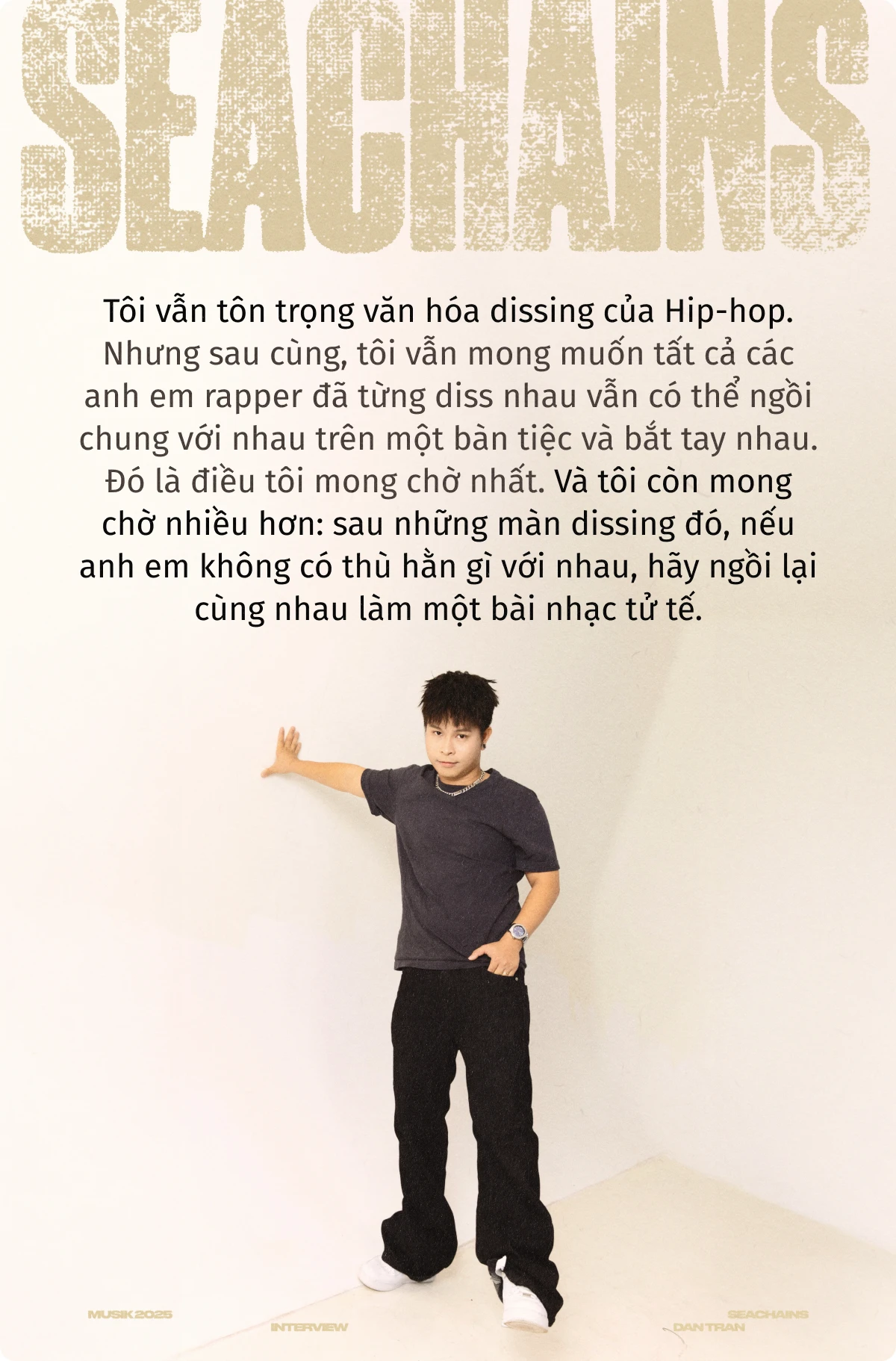Seachains: Tôi vẫn tôn trọng văn hóa dissing của Hip-hop. Nhưng sau cùng, tôi vẫn mong muốn tất cả các anh em rapper đã từng diss nhau vẫn có thể ngồi chung với nhau trên một bàn tiệc và bắt tay nhau. Đó là điều tôi mong chờ nhất. Và tôi còn mong chờ nhiều hơn: sau những màn dissing đó, nếu anh em không có thù hằn gì với nhau, hãy ngồi lại cùng nhau làm một bài nhạc tử tế.