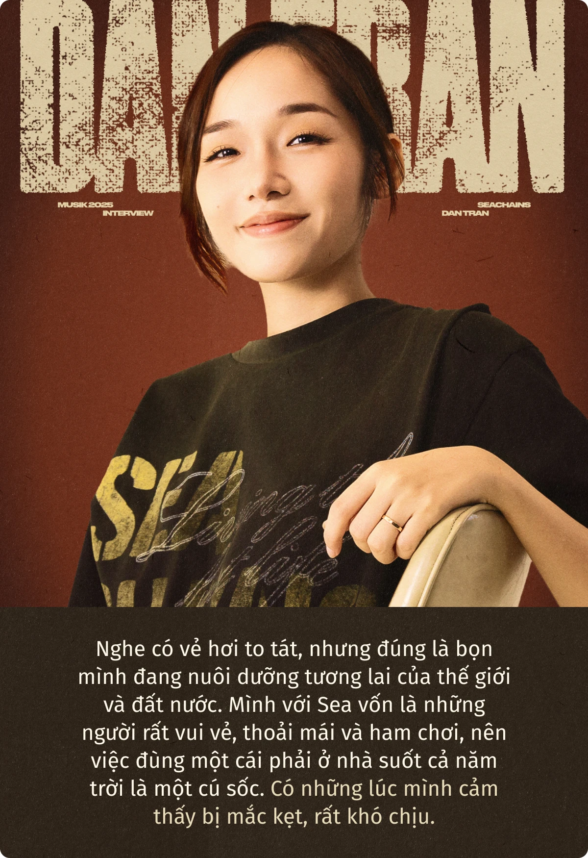 Đây là cuộc phỏng vấn đầu tiên của Seachains sau gần nửa thập kỷ rút lui khỏi showbiz. Seachains và Dan Tran vô cùng cởi mở, tự nhiên tâm sự chuyện âm nhạc , gia đình và cả áp lực khi làm bố mẹ ở tuổi rất trẻ.