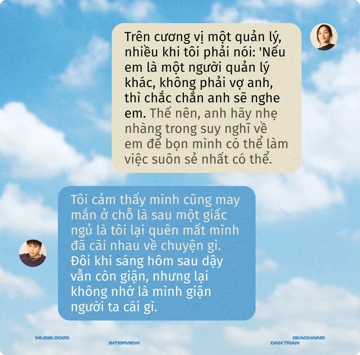 Dan Tran: Cái đấy là cãi nhau hơi bị nhiều đấy, phải nói là siêu nhiều luôn! Năm đầu tiên bọn tôi cãi nhau rất nhiều. Tính tôi thì hơi thẳng, cái gì cảm thấy chưa ổn là tôi nói ngay. Nhưng bạn Sea lại có cái tôi nghệ sĩ rất cao, thường phản ứng kiểu ‘Em thì biết cái gì!’. Nhiều hôm, bạn ấy còn hỏi ‘Tại sao em lại không tin anh?’, tôi phải đáp lại ‘Ủa, thế bây giờ tôi không tin anh thì tôi lấy anh làm gì?’. Tức là, cả hai đều nhạy cảm. Nhưng trên cương vị một quản lý, nhiều khi tôi phải nói: ‘Nếu em là một người quản lý khác, không phải vợ anh, thì chắc chắn anh sẽ nghe em. Thế nên, anh hãy nhẹ nhàng trong suy nghĩ về em để bọn mình có thể làm việc suôn sẻ nhất có thể.’ Cũng mất khá nhiều thời gian để cãi nhau. Nhưng bây giờ thì trộm vía, quy trình làm việc của bọn tôi đã đỡ hơn rất nhiều, và cũng đỡ mất thời gian cãi vã. Phụ nữ mà, khi cãi nhau là sẽ bị mắc kẹt trong chuyện đó tầm một đến hai ngày, còn đàn ông thì xong là xong luôn. Việc bị mắc kẹt lại đó nhiều khi cũng khá căng thẳng với tôi, nhưng bây giờ tôi cảm thấy mình cũng đã ổn hơn rồi.