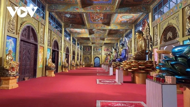 Bên trong Đại Hùng Bảo Điện, du khách sẽ được chiêm bái ba pho tượng Phật cao 21m gồm Phật Thích Ca, Phật Dược Sư và Phật A Di Đà. Đặc biệt, dọc hai bức tường là 64 bức phù điêu được chạm khắc tinh xảo, tái hiện trọn vẹn cuộc đời của Đức Phật, mang lại cảm giác uy nghiêm và tịnh độ.