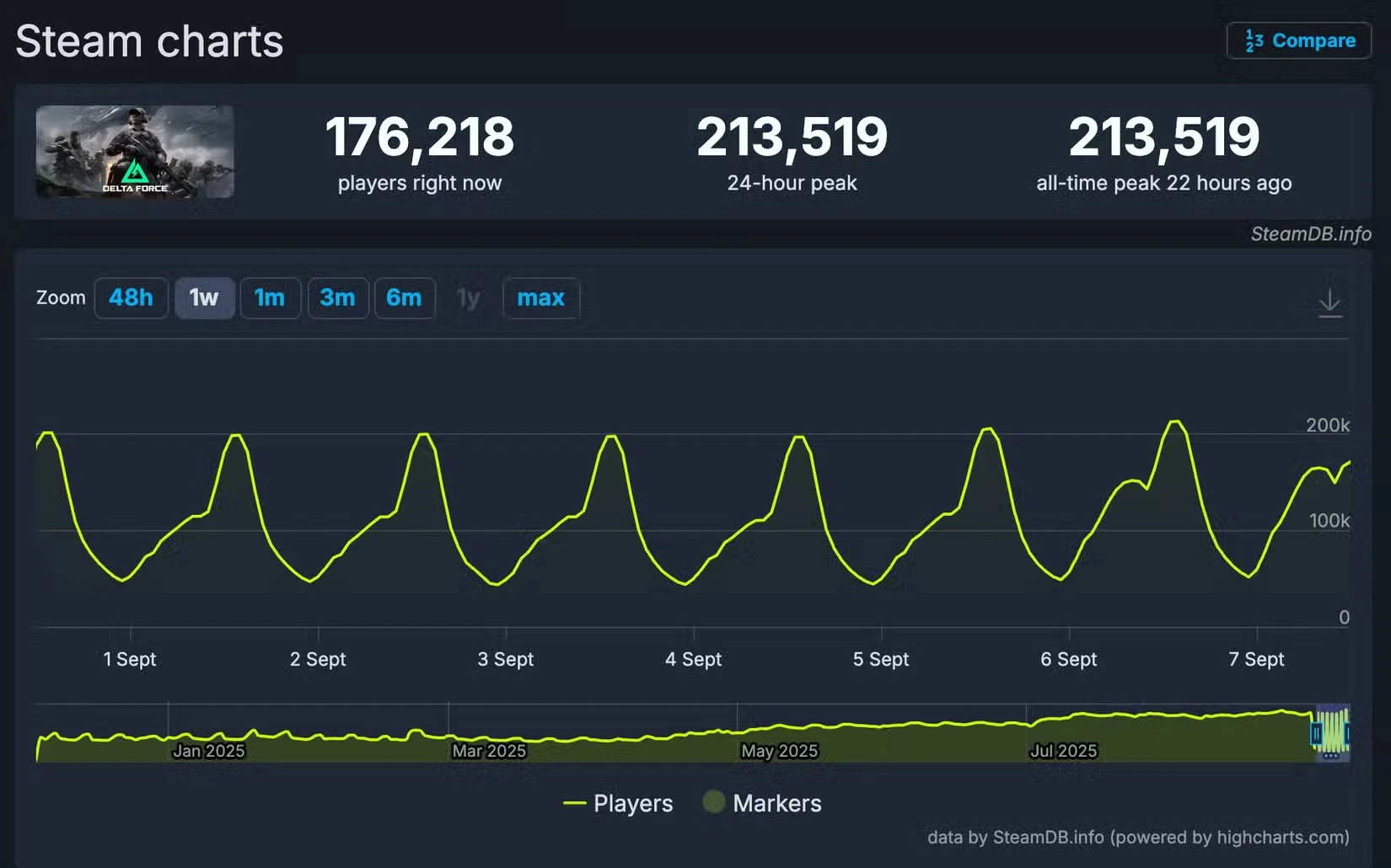 Theo dữ liệu từ SteamDB, tựa game Delta Force vừa xác lập kỷ lục mới với 213.519 người chơi trực tuyến cùng lúc, vượt qua con số 210.413 thiết lập hồi giữa tháng 8.