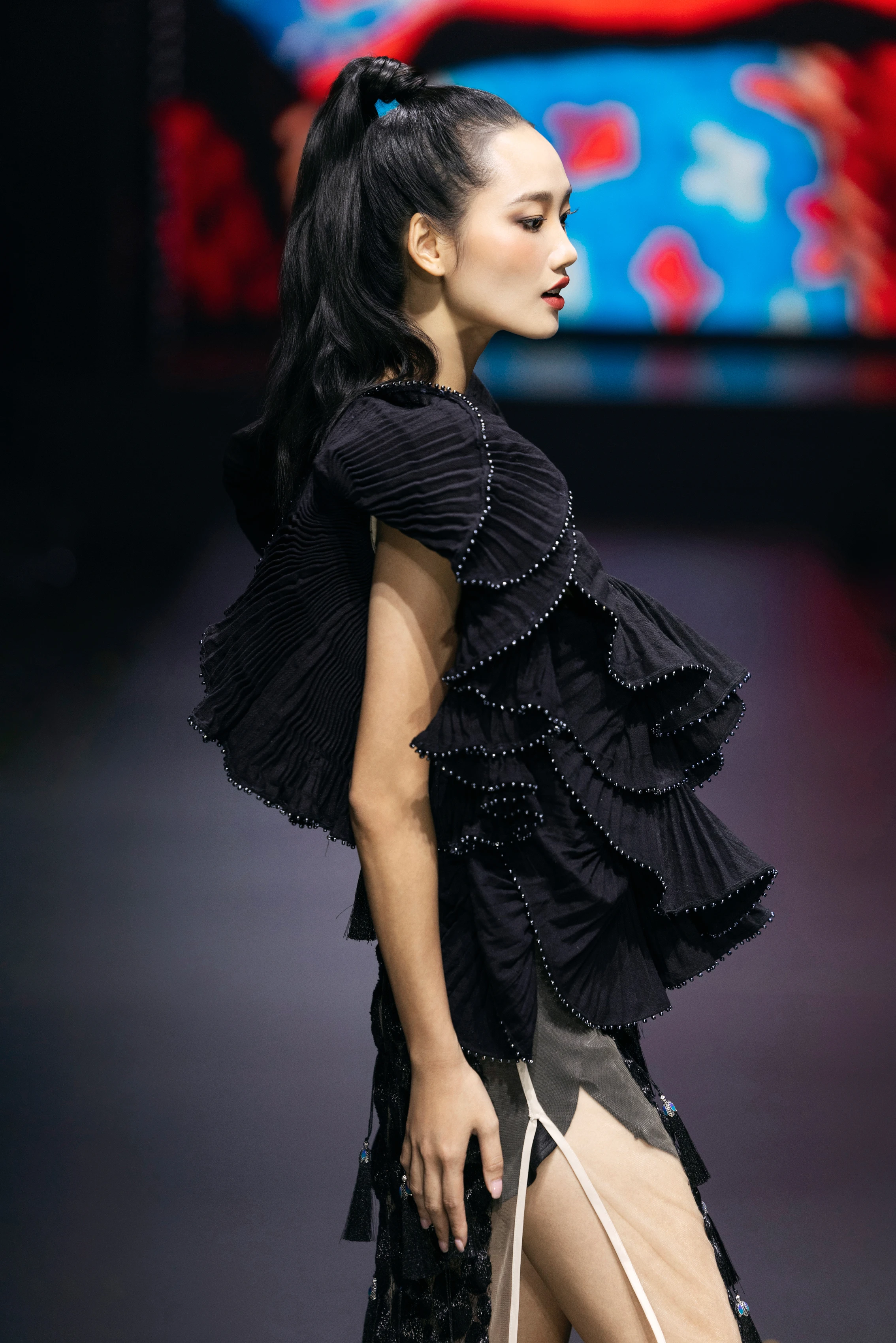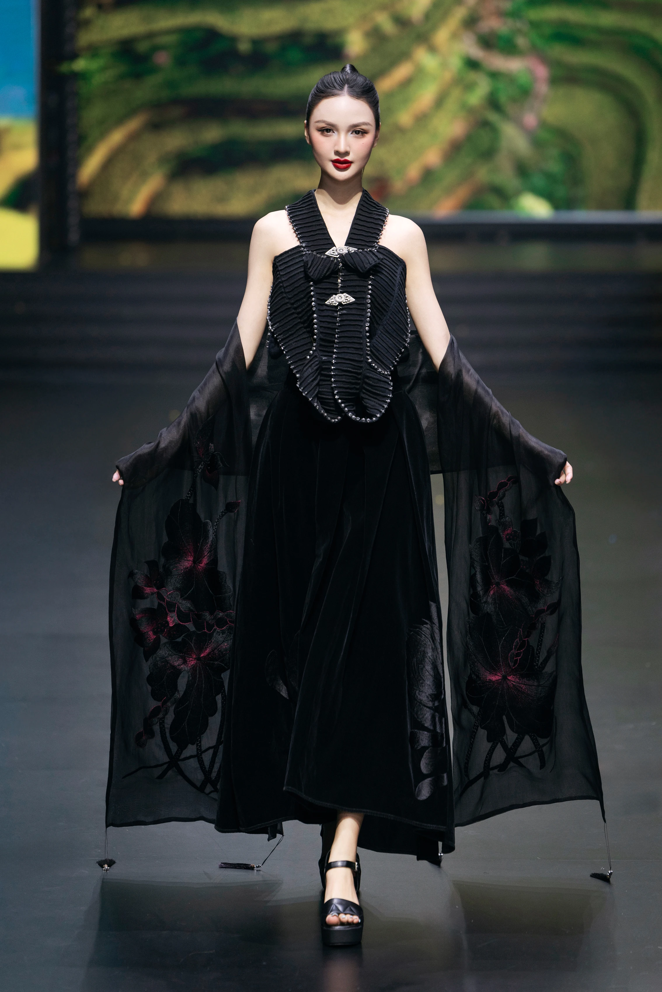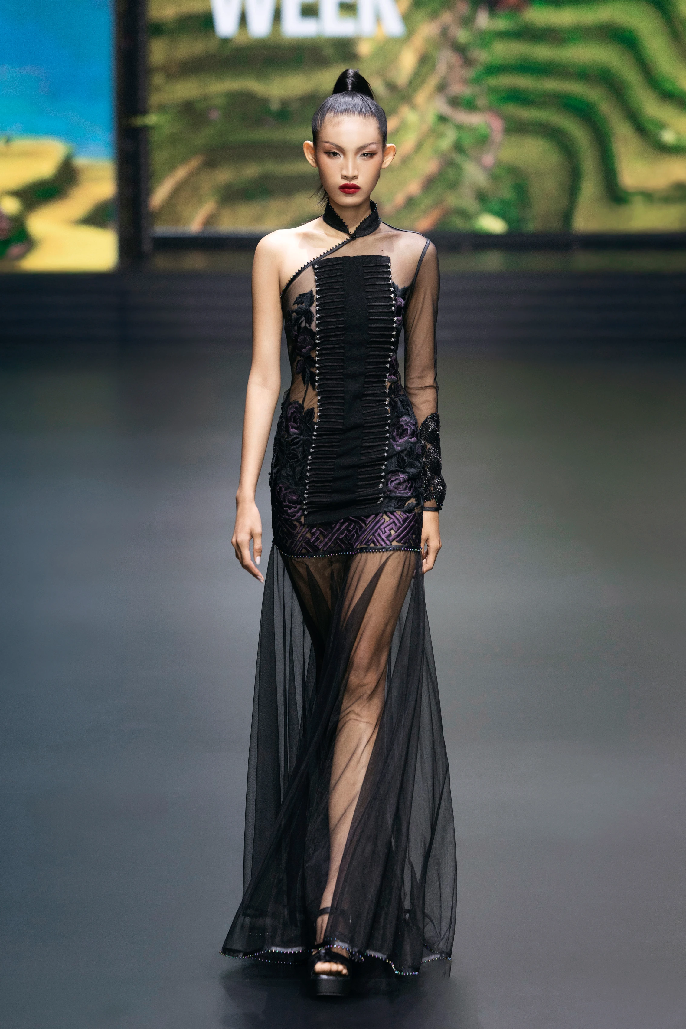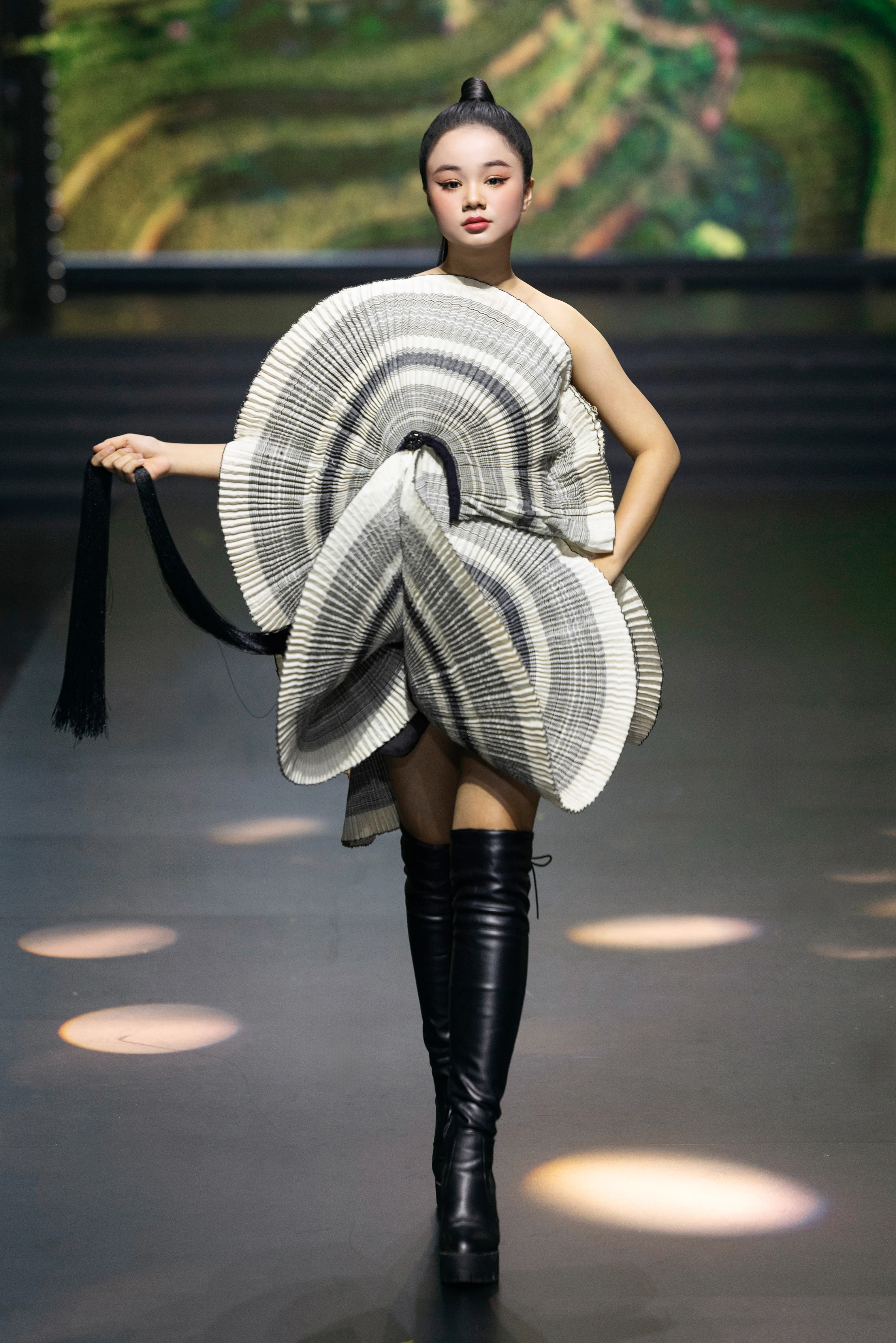 Á hậu Quỳnh Anh xuất hiện mở màn đầy cuốn hút. Thiết kế bao gồm phần thân trên là những lớp xếp ly thủ công xếp tầng cầu kỳ, mô phỏng đường cong mềm mại của sườn núi Tây Bắc, phần thân dưới là lớp voan trong suốt, điểm tua rua dọc thân mang hiệu ứng chuyển động uyển chuyển theo từng bước catwalk