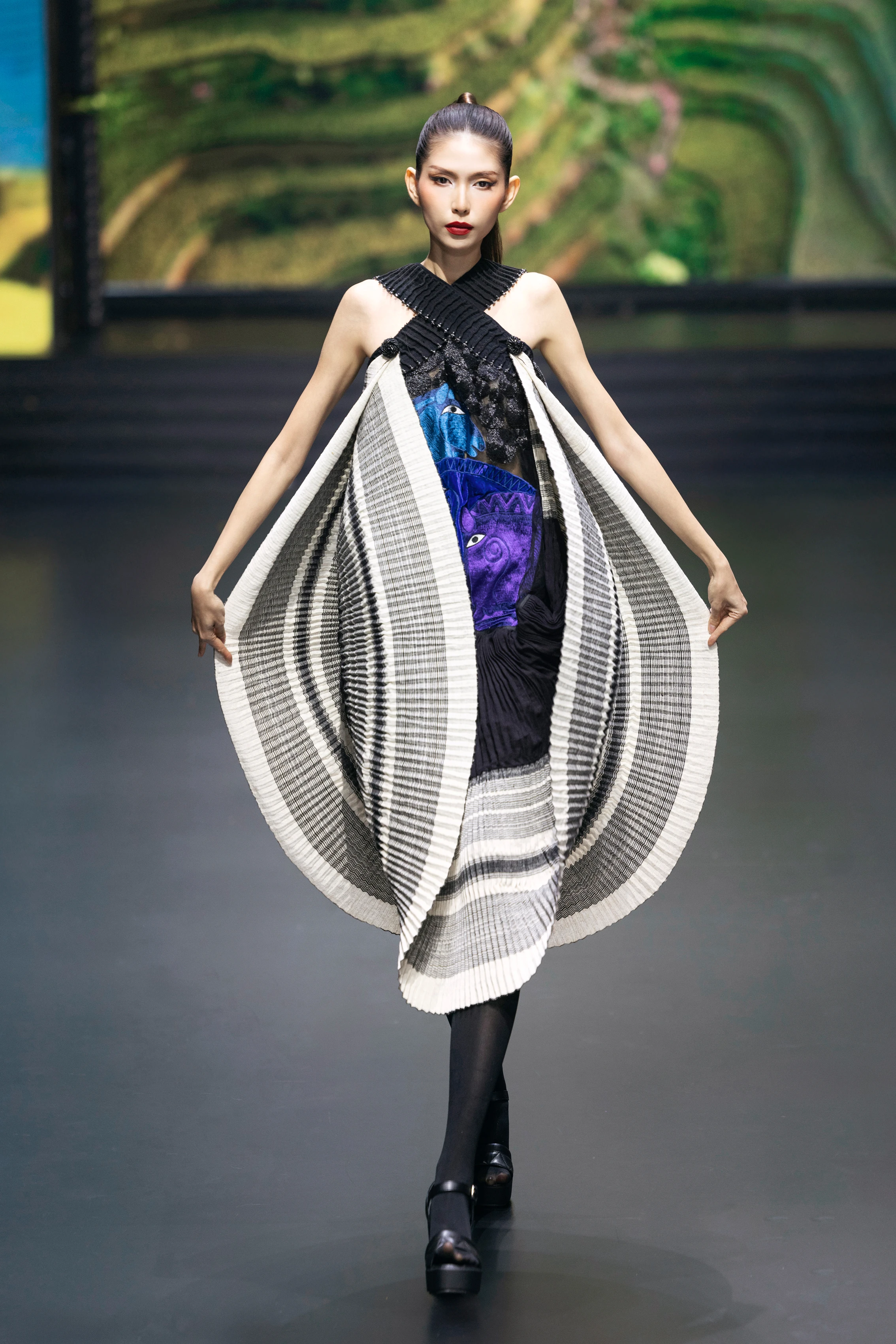 Qua lăng kính nghệ thuật của NTK Vũ Việt Hà, hành trình khám phá sắc màu Tây Bắc hiện lên vô cùng sinh động và rõ nét. Không dừng lại ở việc tái hiện, anh còn thổi hồn cho chất liệu truyền thống trở nên mới mẻ hơn bằng hiệu ứng Op Art, dẫn dắt người xem bằng 40 mẫu thiết kế đặc sắc với nhiều cung bậc cảm xúc từ nông sâu đến hồ hởi nhưng có khi lại nhẹ nhàng, bay bổng