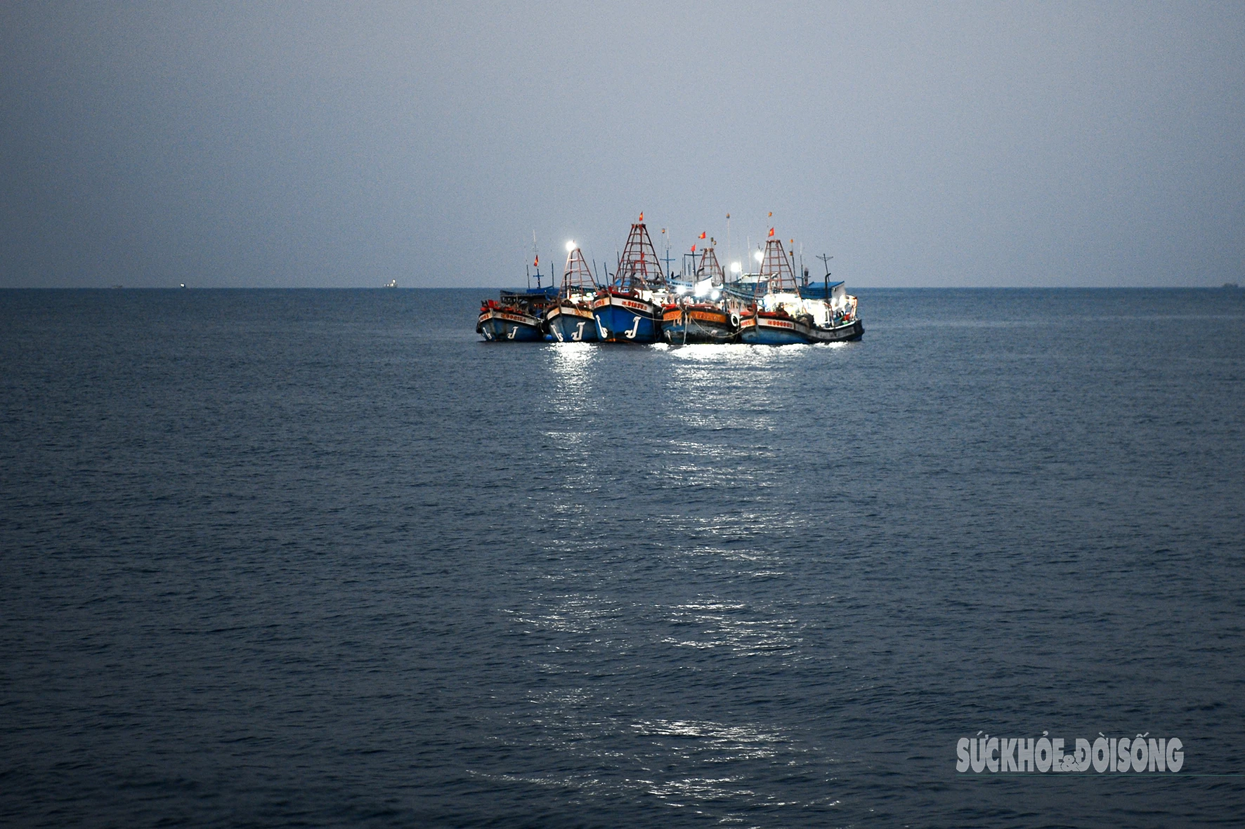 Những con tàu đánh cá quây cụm bật đèn giữa biển sớm, tạo dải sáng lung linh phản chiếu trên mặt nước.