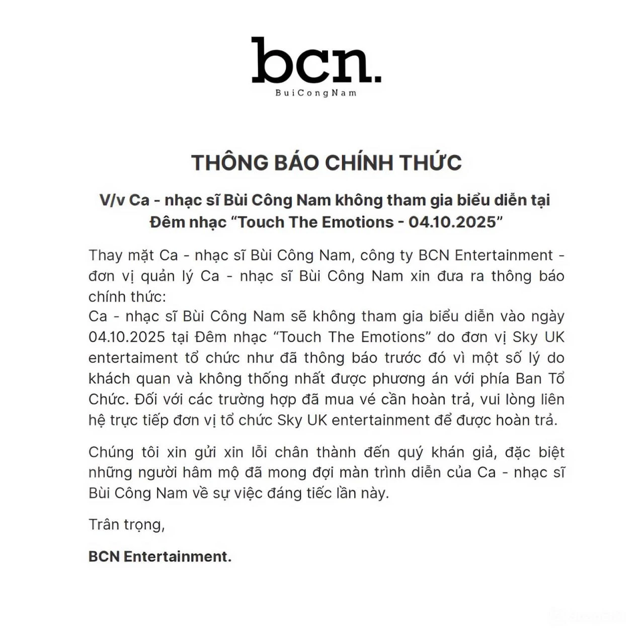 Vào tháng 9, cộng đồng fan của Bùi Công Nam xôn xao trước thông báo từ công ty quản lý BCN Entertainment về việc nam ca nhạc sĩ hủy lịch trình biểu diễn tại đêm nhạc Touch The Emotions, dự kiến diễn ra ngày 4/10.