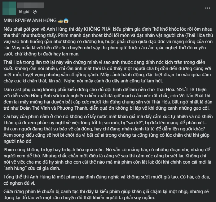 Tuy nhiên, điểm sáng lớn nhất của Anh Hùng chính là diễn xuất của Thái Hòa. Thể hiện người cha đơn thân Hùng dùng chiêu trò lừa đảo từ thiện để cứu mạng con gái, Thái Hòa được khen ấn tượng đến từng ánh mắt, xứng danh “đỉnh nóc kịch trần” về diễn xuất, khiến người xem vừa thương cảm, vừa trách cứ nhân vật đầy lầm lỡ này.