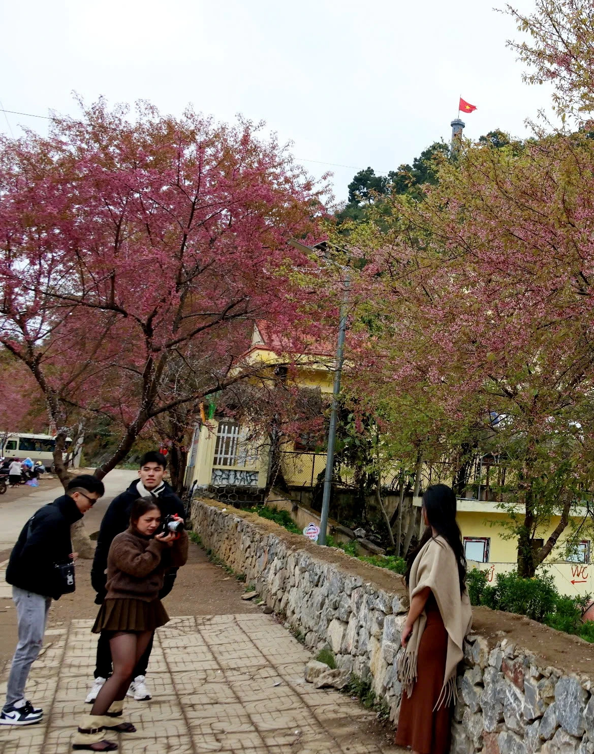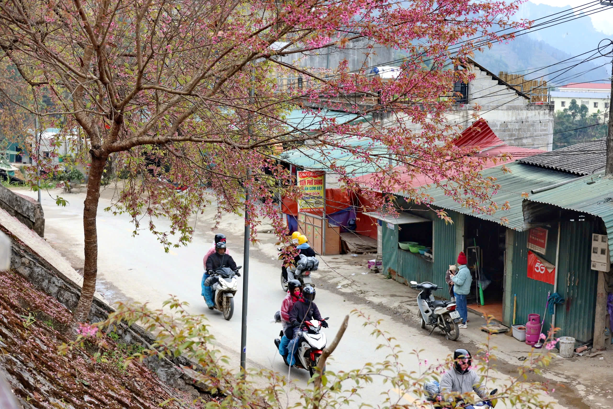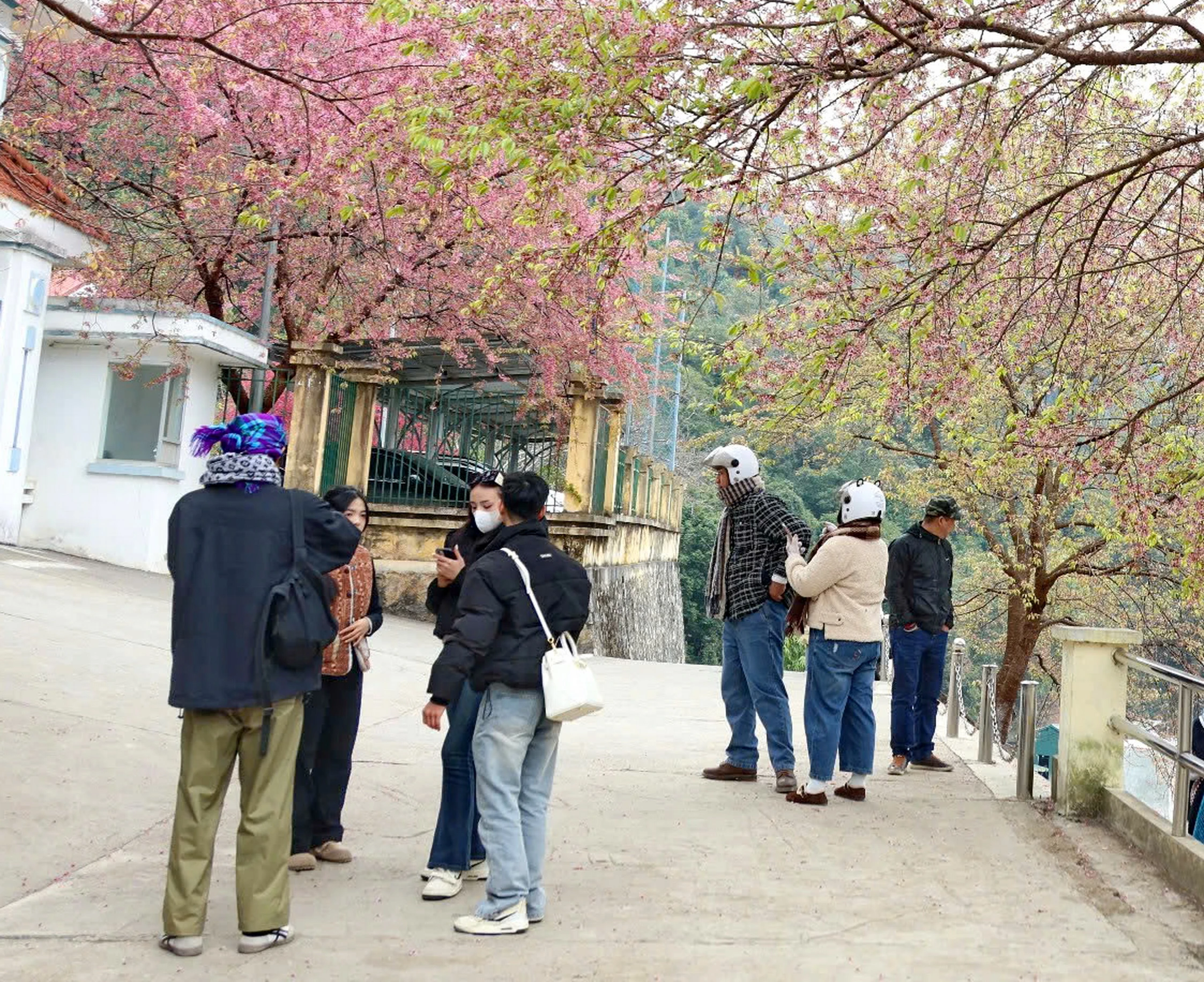 Dưới chân Cột cờ Lũng Cú, những tán hoa khoe sắc như một nét vẽ mềm mại. Phóng tầm mắt ra xa, du khách sẽ bắt gặp hình ảnh hoa anh đào phủ bóng yên bình lên khuôn viên Đồn biên phòng Lũng Cú.