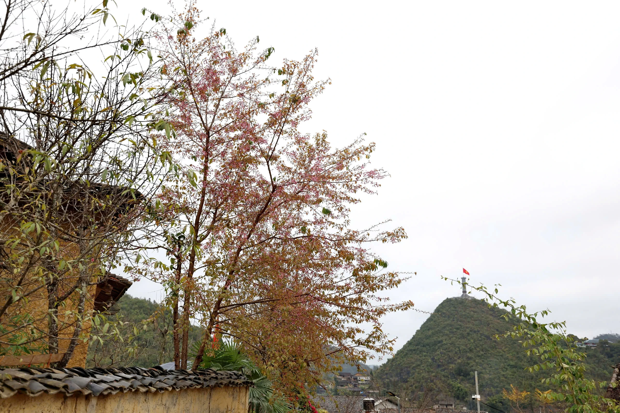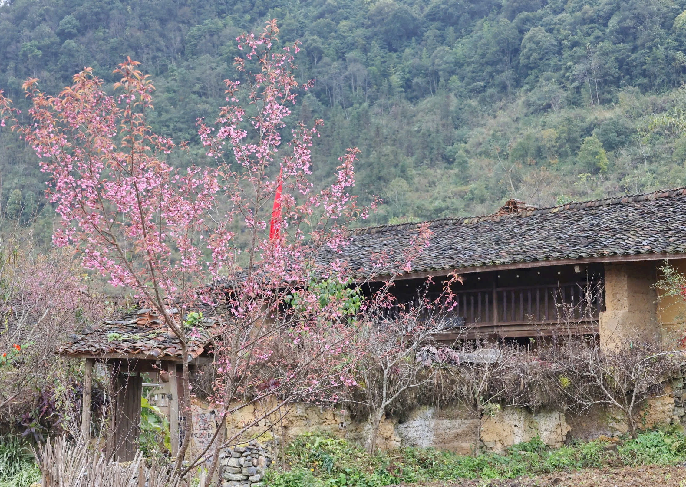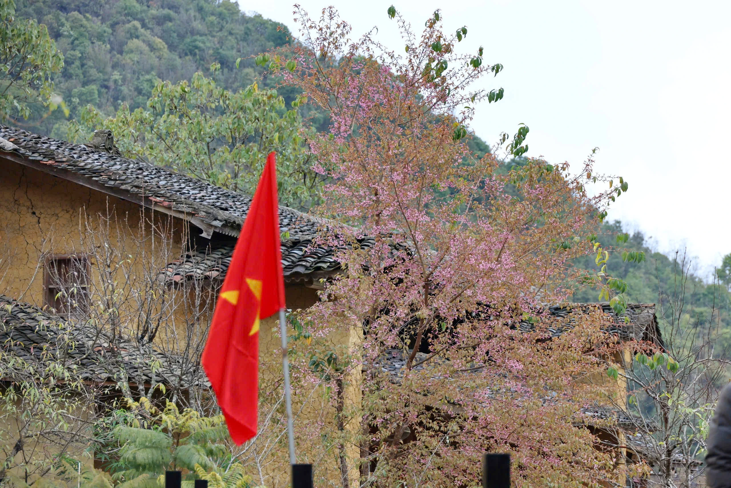 Sắc hồng dịu dàng ấy điểm xuyết bên những nếp nhà trình tường cổ kính của đồng bào Lô Lô, tạo nên một sự hòa quyện tuyệt mĩ giữa thiên nhiên.