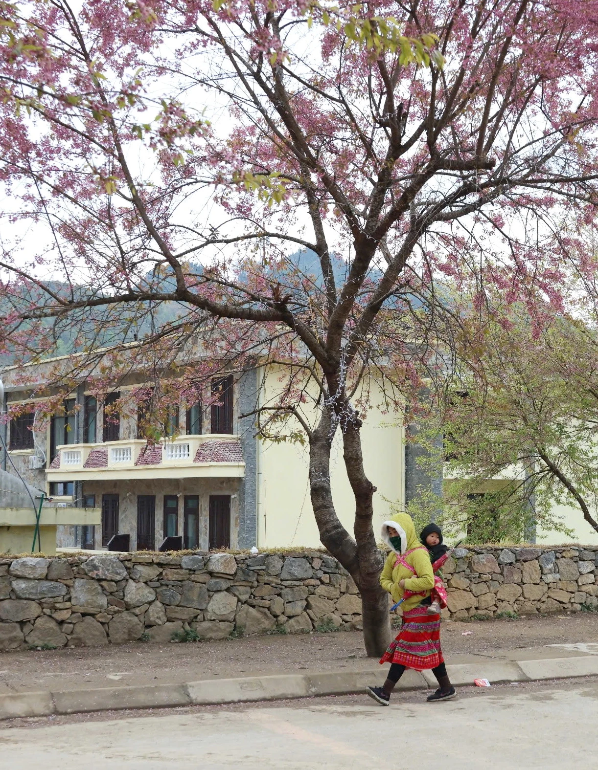Hoa anh đào cũng khoe sắc rực rỡ ngay trước cổng trường mầm non Lũng Cú, mang không khí xuân ấm áp tràn ngập không gian học đường vùng cao.