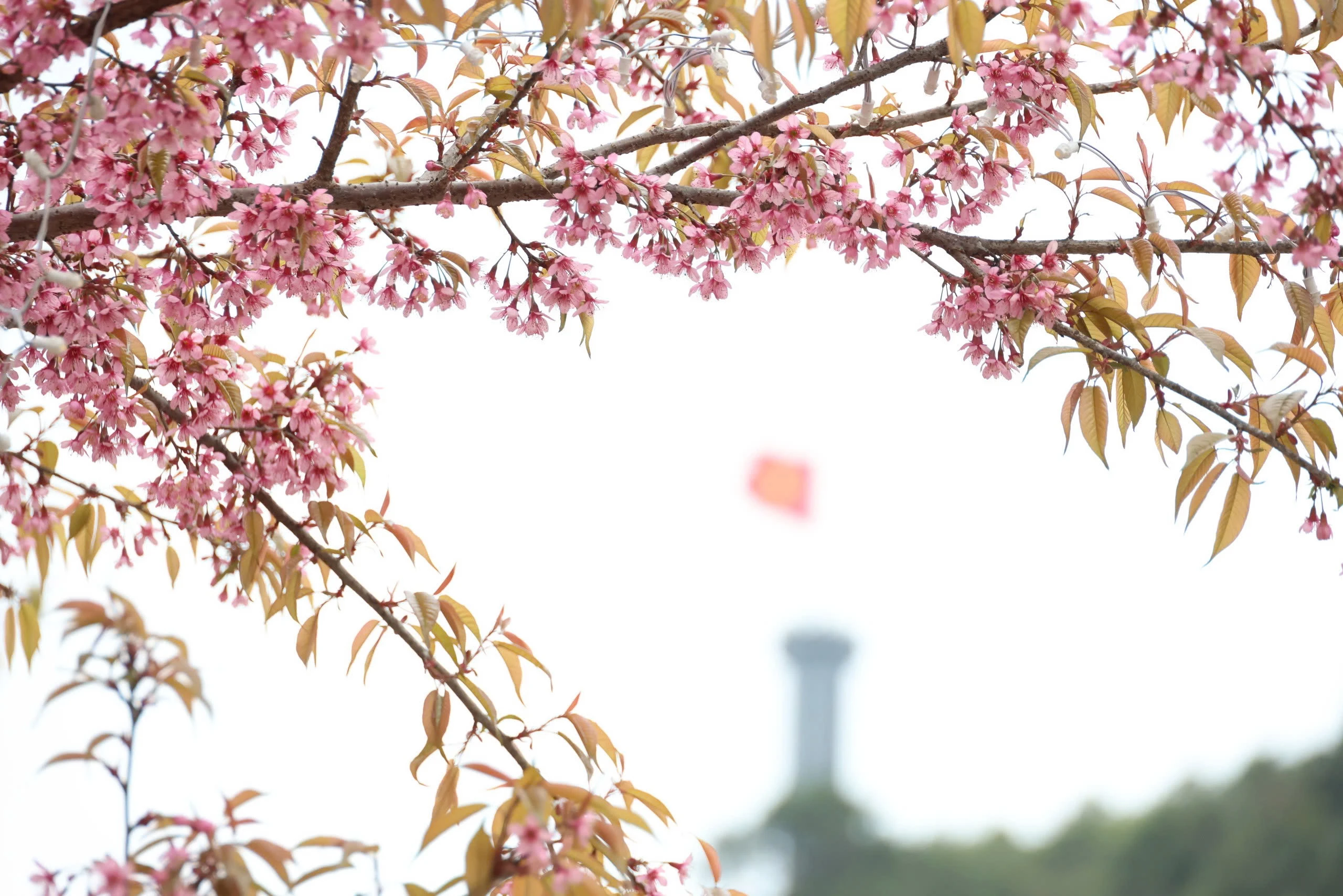 Nhưng có lẽ, điểm nhấn làm say lòng người nhất chính là bức tranh xuân vừa thơ mộng vừa hùng tráng khi sắc hoa hồng nhạt hòa cùng màu cờ đỏ sao vàng tung bay trong gió.